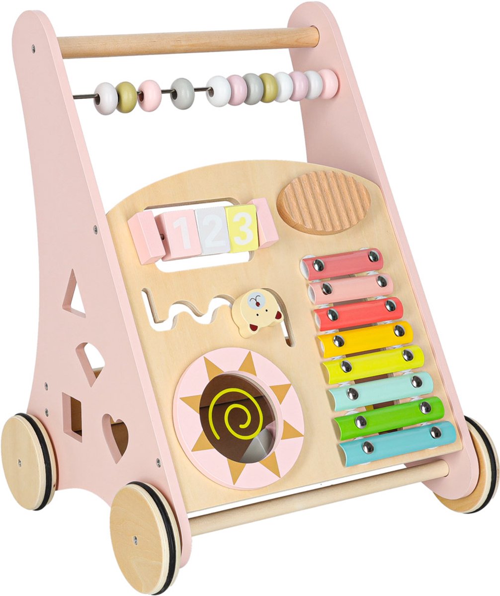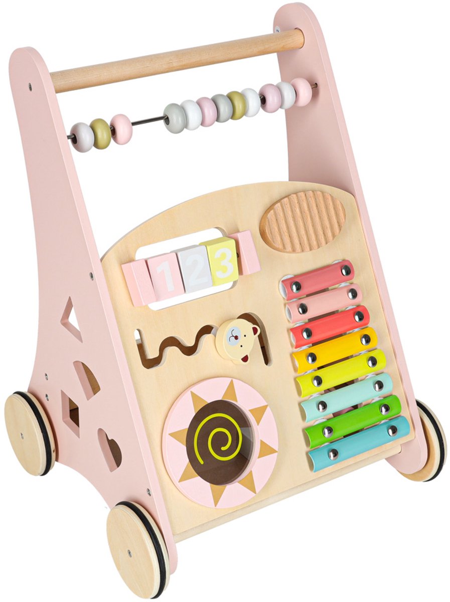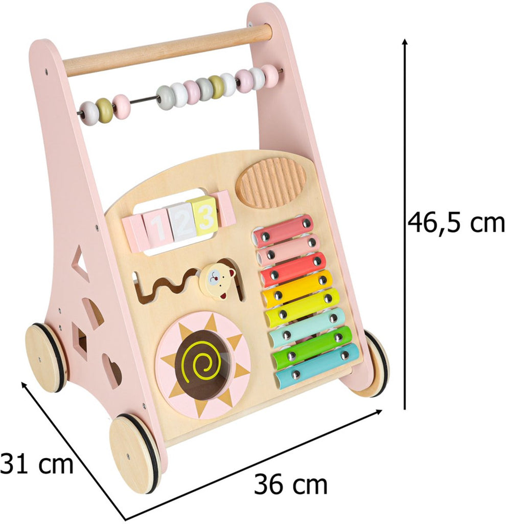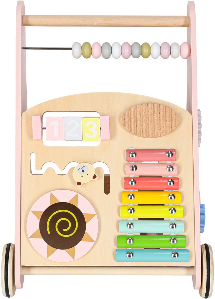 Ontdek de unieke houten loopwagen met educatieve functies, speciaal ontworpen om de eerste stappen van je kindje te ondersteunen en de ontwikkeling op speelse wijze te stimuleren. Deze multifunctionele loopwagen combineert leren en entertainment met o.a. een abacus, xylofoon, vormensorteerder en kleurrijke blokken, waardoor je kleintje op een veilige en leuke manier de wereld ontdekt.