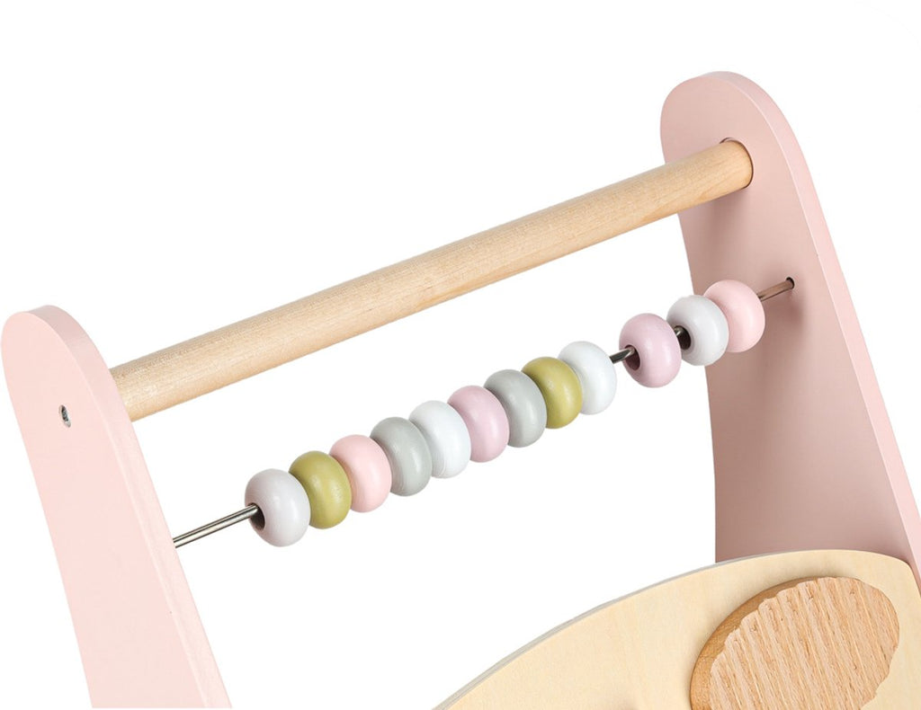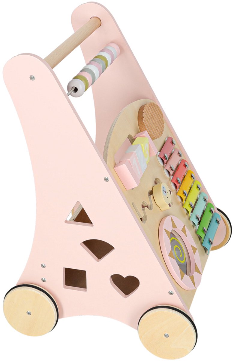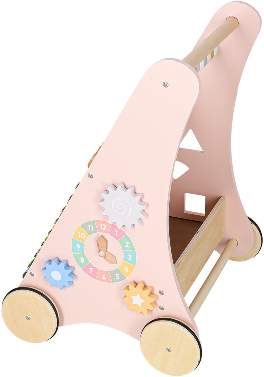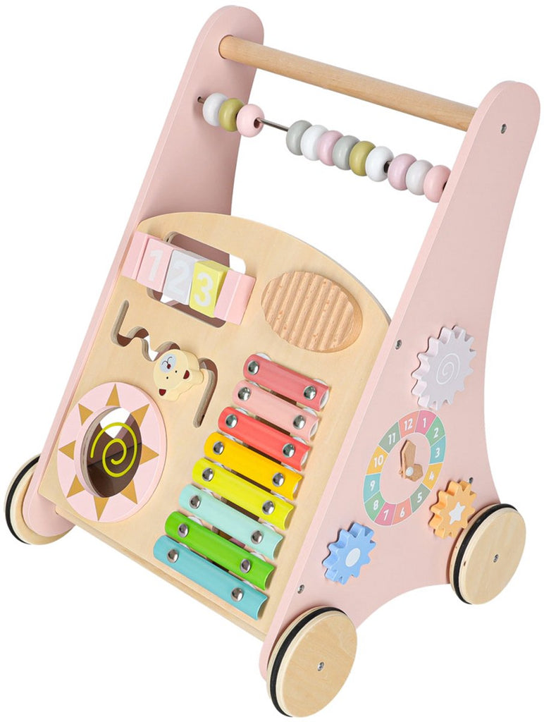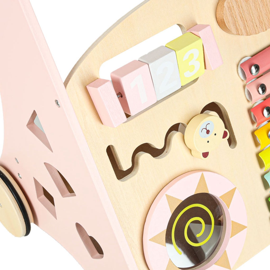 Ontdek de unieke houten loopwagen met educatieve functies, speciaal ontworpen om de eerste stappen van je kindje te ondersteunen en de ontwikkeling op speelse wijze te stimuleren. Deze multifunctionele loopwagen combineert leren en entertainment met o.a. een abacus, xylofoon, vormensorteerder en kleurrijke blokken, waardoor je kleintje op een veilige en leuke manier de wereld ontdekt.