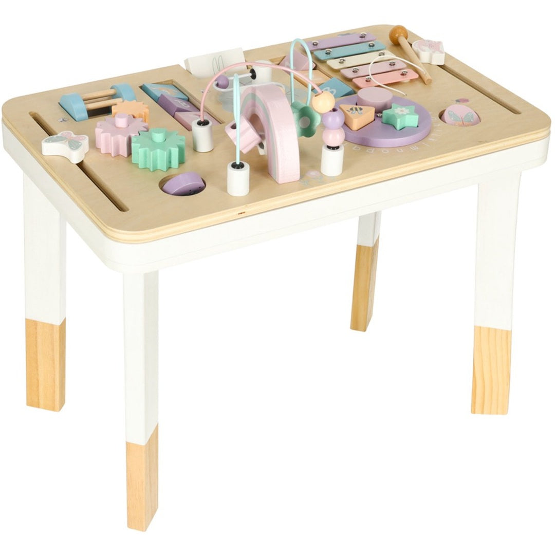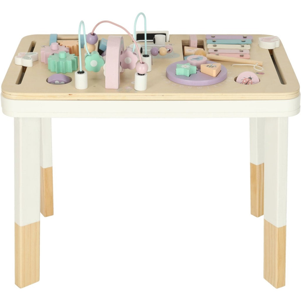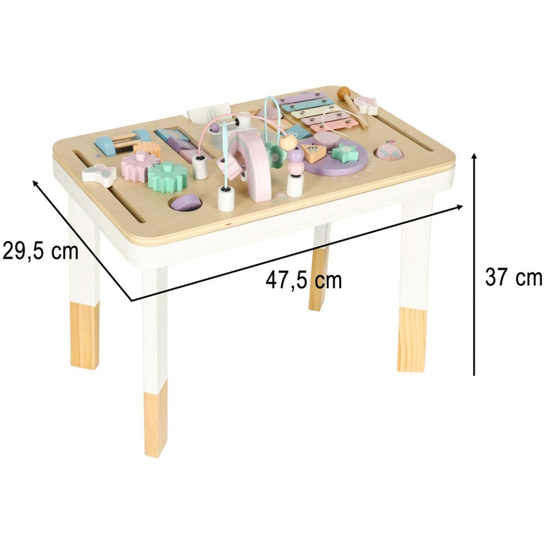 • Veelzijdige speelmogelijkheden – De tafel beschikt over verschillende elementen, zoals schuifjes, beweegbare kubussen, tandwielen, een vormsorteerder, een xylofoon met een hamertje, en doolpaden met kleurrijke kralen. Zo leren kinderen spelenderwijs over vormen, kleuren en geluiden.