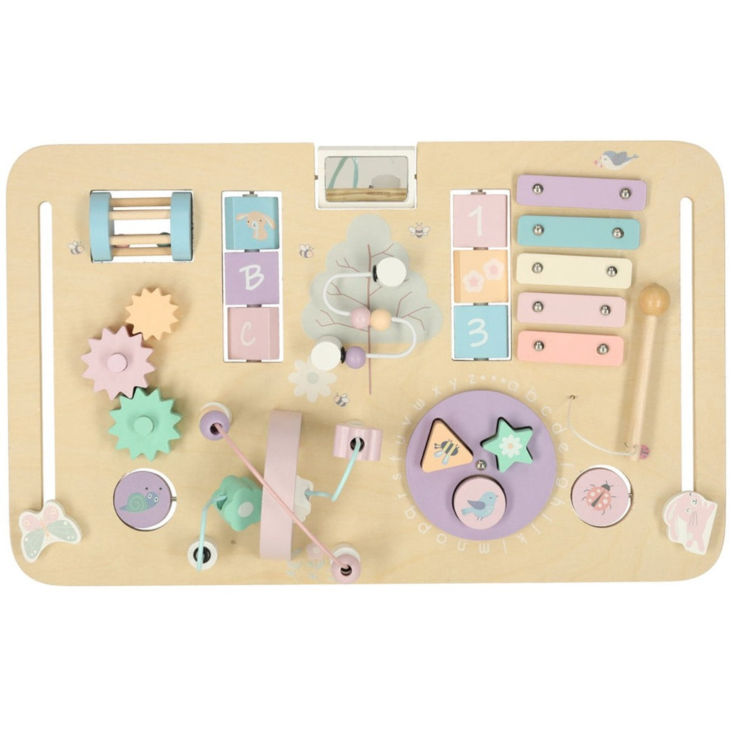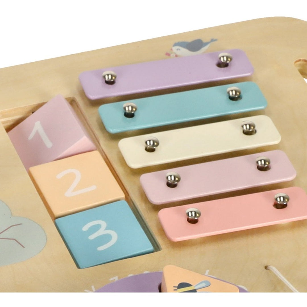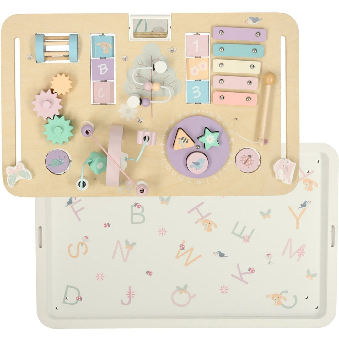 • Veelzijdige speelmogelijkheden – De tafel beschikt over verschillende elementen, zoals schuifjes, beweegbare kubussen, tandwielen, een vormsorteerder, een xylofoon met een hamertje, en doolpaden met kleurrijke kralen. Zo leren kinderen spelenderwijs over vormen, kleuren en geluiden.