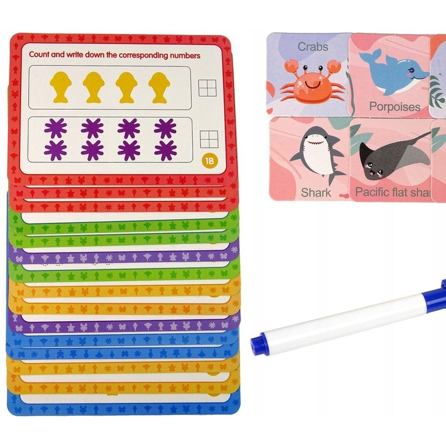 Deze educatieve set van het merk Playos is een eenvoudig maar effectief hulpmiddel bij het leren en plezier maken. Het spel bestaat uit het uitvoeren van een rekenkundige oefening op een kaart, met behulp van figuren en een marker. Leer gemakkelijk tellen en sorteren!