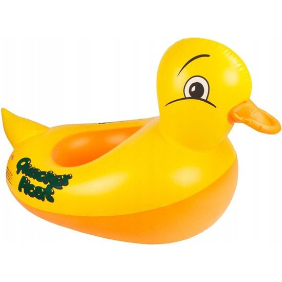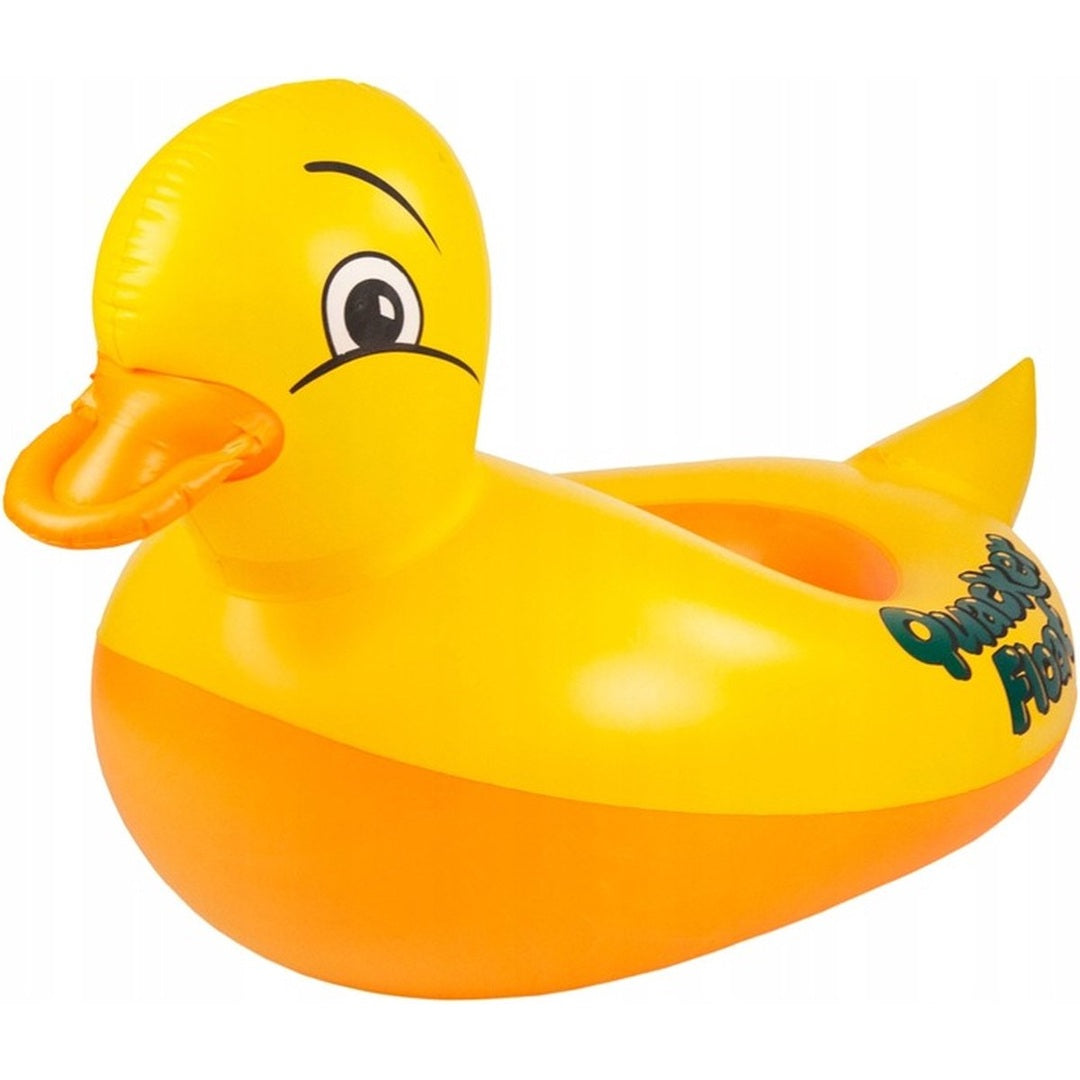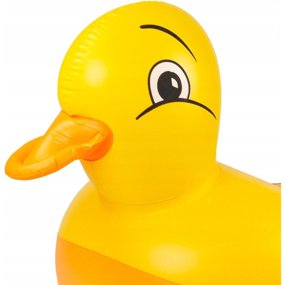 De opblaasbare geel-oranje zwemband in de originele vorm van een eend dient als opblaasboot voor kinderen
