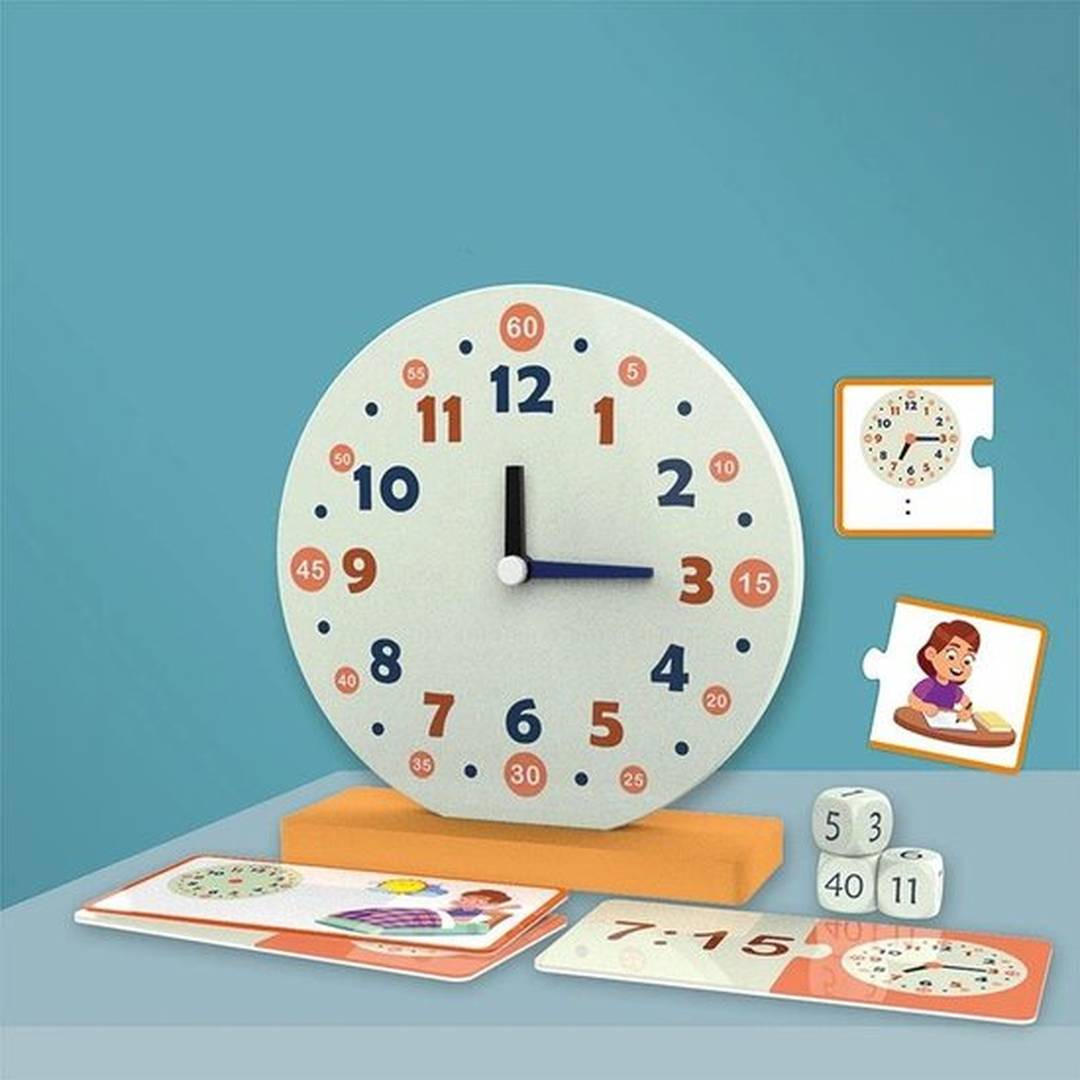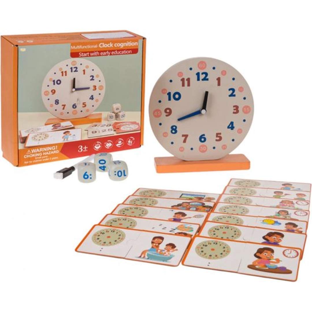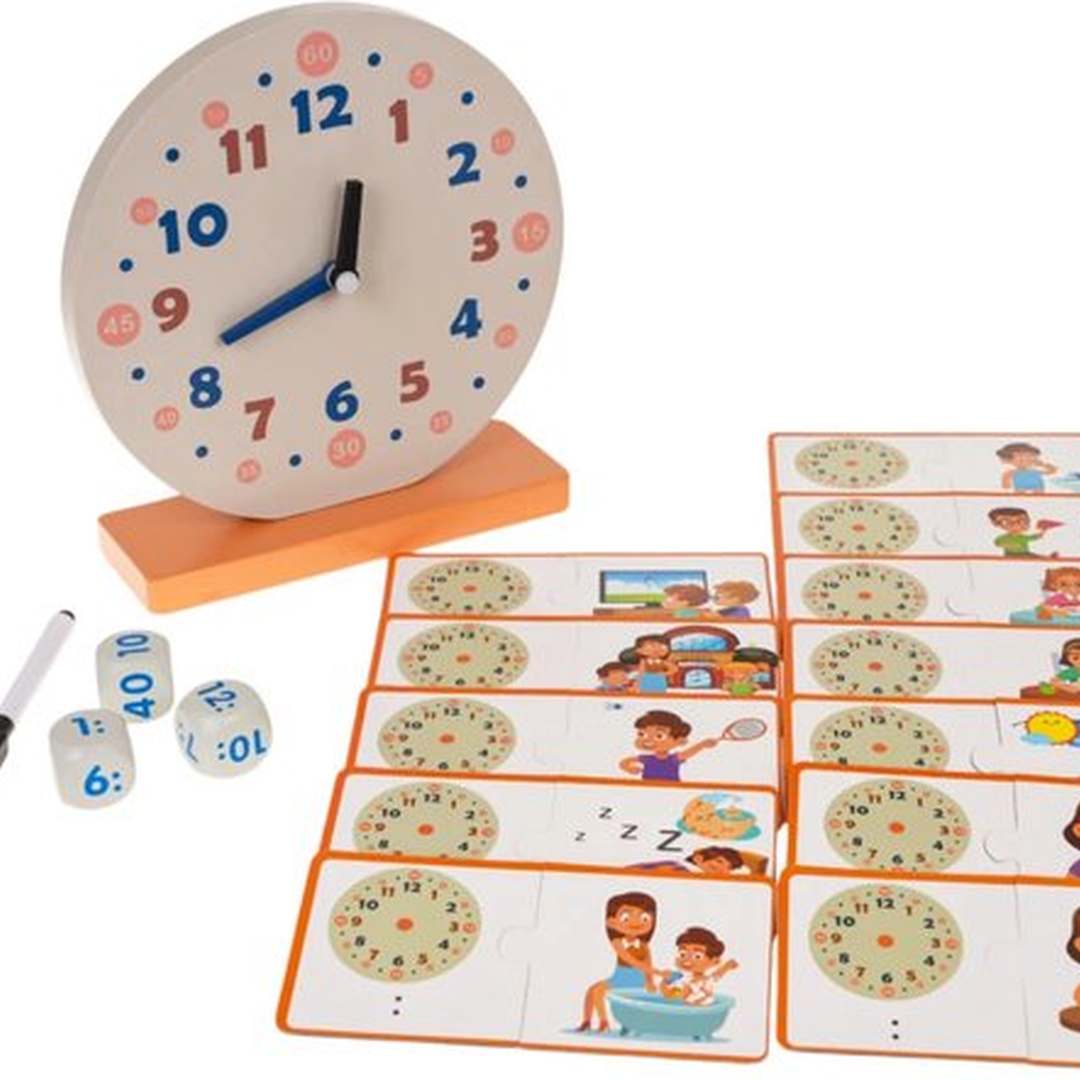 Educatieve set met een klok en accessoires voor kinderen vanaf 3 jaar. De set bevat een grote houten klok met beweegbare wijzers, 3 dobbelstenen, 24 elementen om in elkaar te zetten en een stift. Met deze set leert een kind om te gaan met een horloge en worden geheugen, concentratie en waarnemingsvermogen getraind.