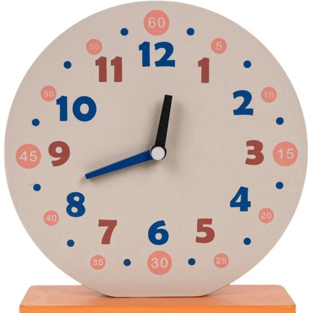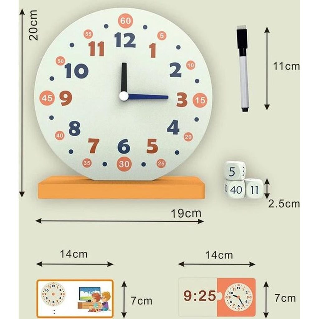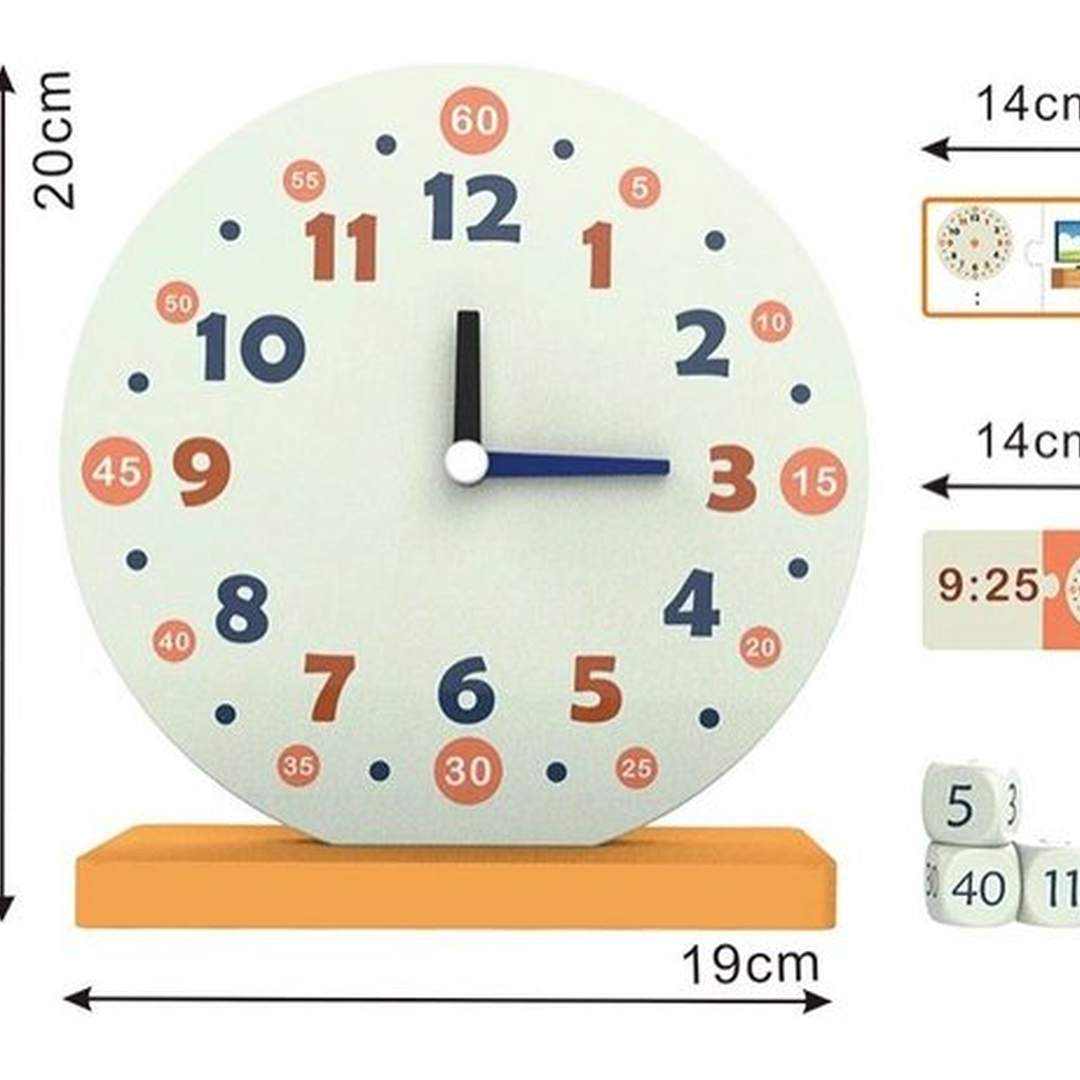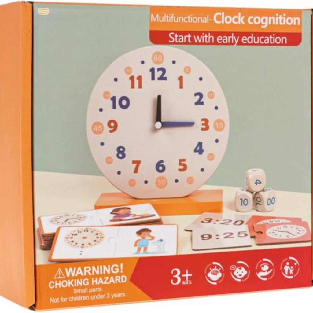 Educatieve set met een klok en accessoires voor kinderen vanaf 3 jaar. De set bevat een grote houten klok met beweegbare wijzers, 3 dobbelstenen, 24 elementen om in elkaar te zetten en een stift. Met deze set leert een kind om te gaan met een horloge en worden geheugen, concentratie en waarnemingsvermogen getraind.