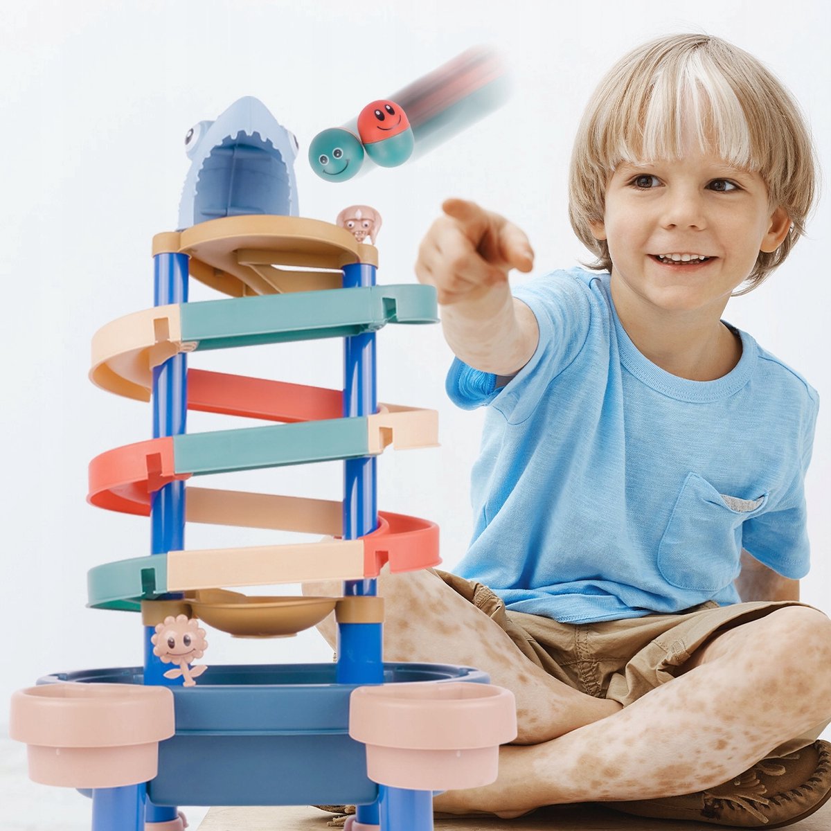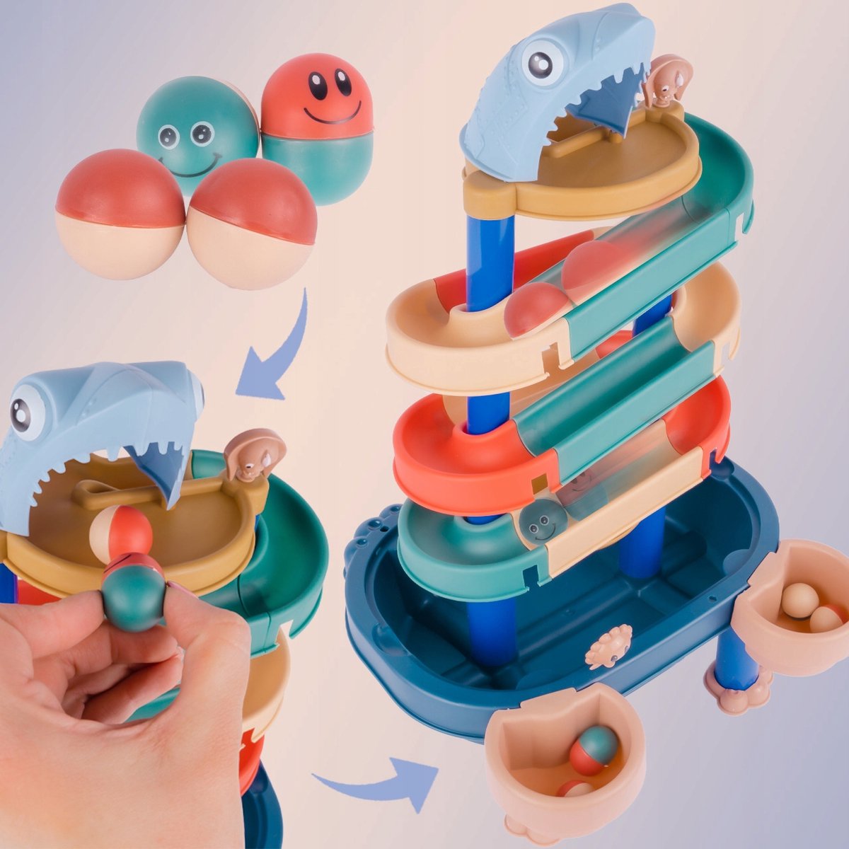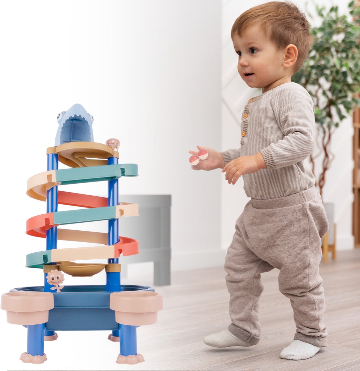 De robuuste constructie en heldere kleuren maken dit speelgoed aantrekkelijk en veilig voor jonge kinderen. Ze kunnen de waterglijbaan gebruiken, de ovale bal laten rollen, en met de balletjes spelen in water of zand. Het speelgoed ondersteunt de ontwikkeling van hand-oogcoördinatie, fijne motoriek en verbeeldingskracht.