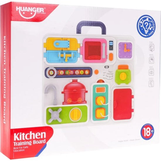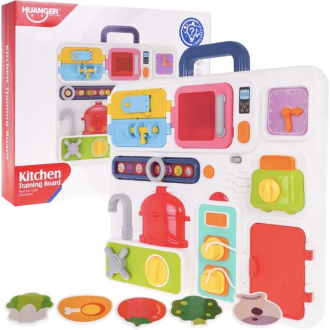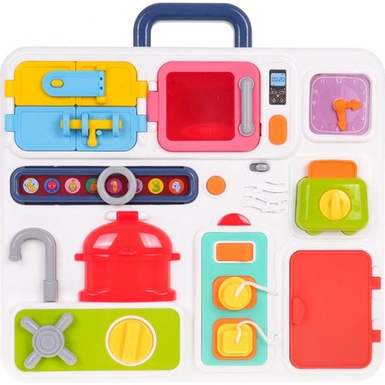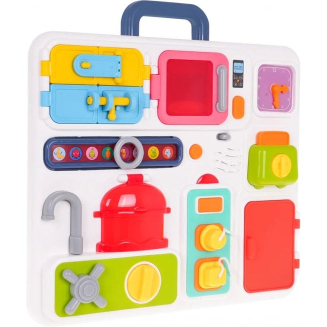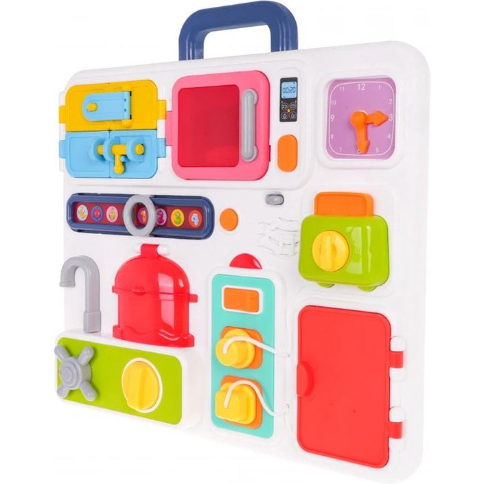 Multifunctioneel, interactief bord met geluids- en lichteffecten voor baby's vanaf 18 maanden. Het heeft veel beweegbare elementen om te openen, te draaien en aan te passen, wat de motorische vaardigheden verbetert. Aan de bovenkant zit een handig handvat om het bord te dragen of te ondersteunen.