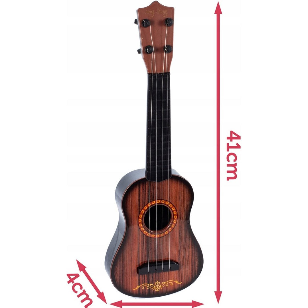 Het speelgoed is gemaakt van plastic in een soortgelijke kleur van hout, heeft vier metalen snaren, verstelbaar op de hals.