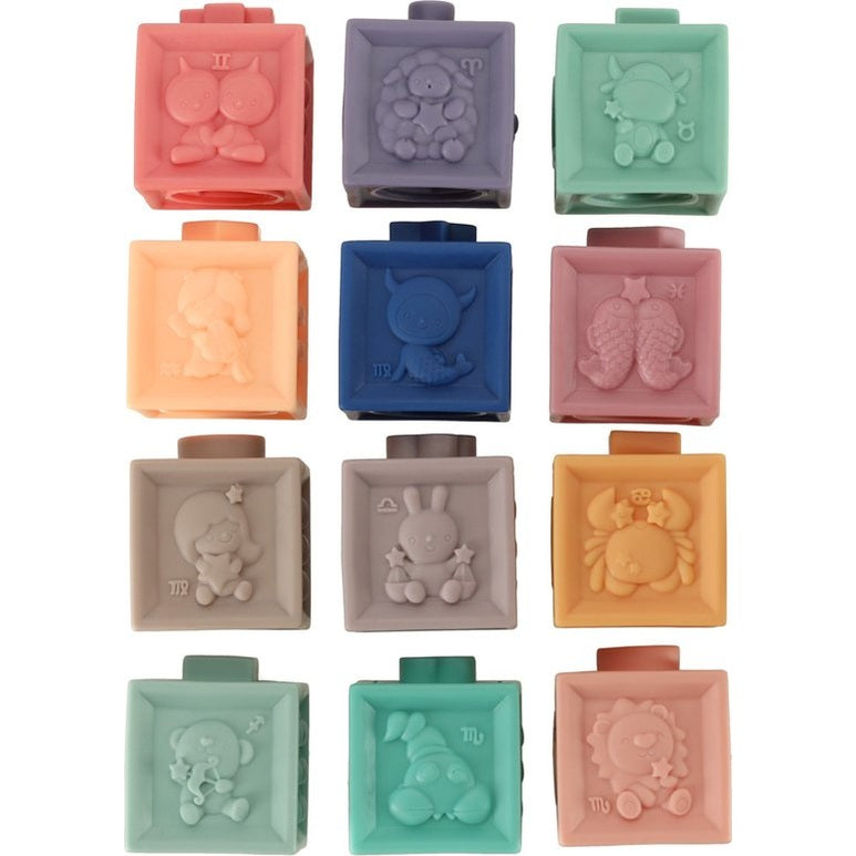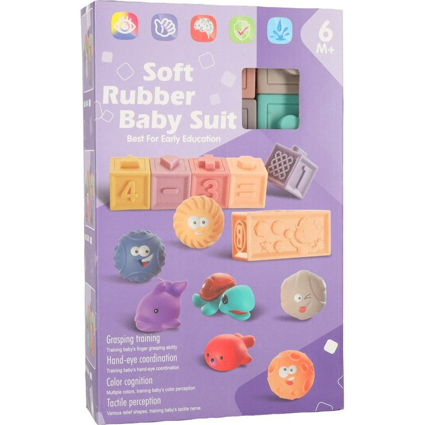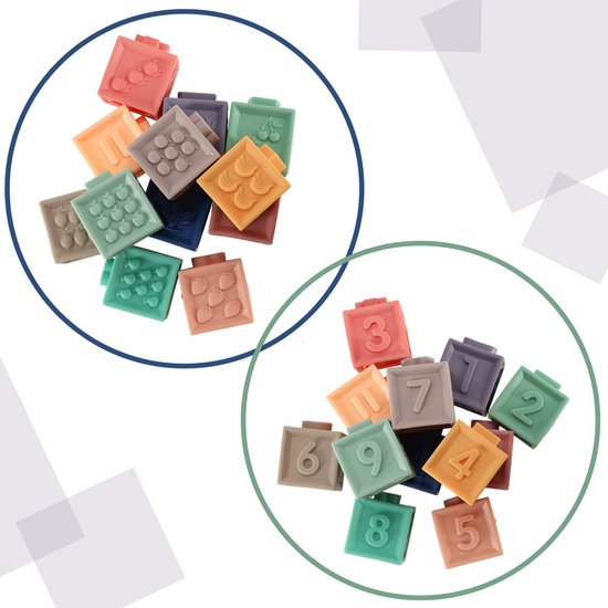 Alle elementen van de educatieve set zijn gemaakt van zacht siliconen en hebben verschillende texturen, waardoor ze ideaal zijn als bijtspeeltjes en de peuter verlichting brengen tijdens het doorkomen van de tandjes.