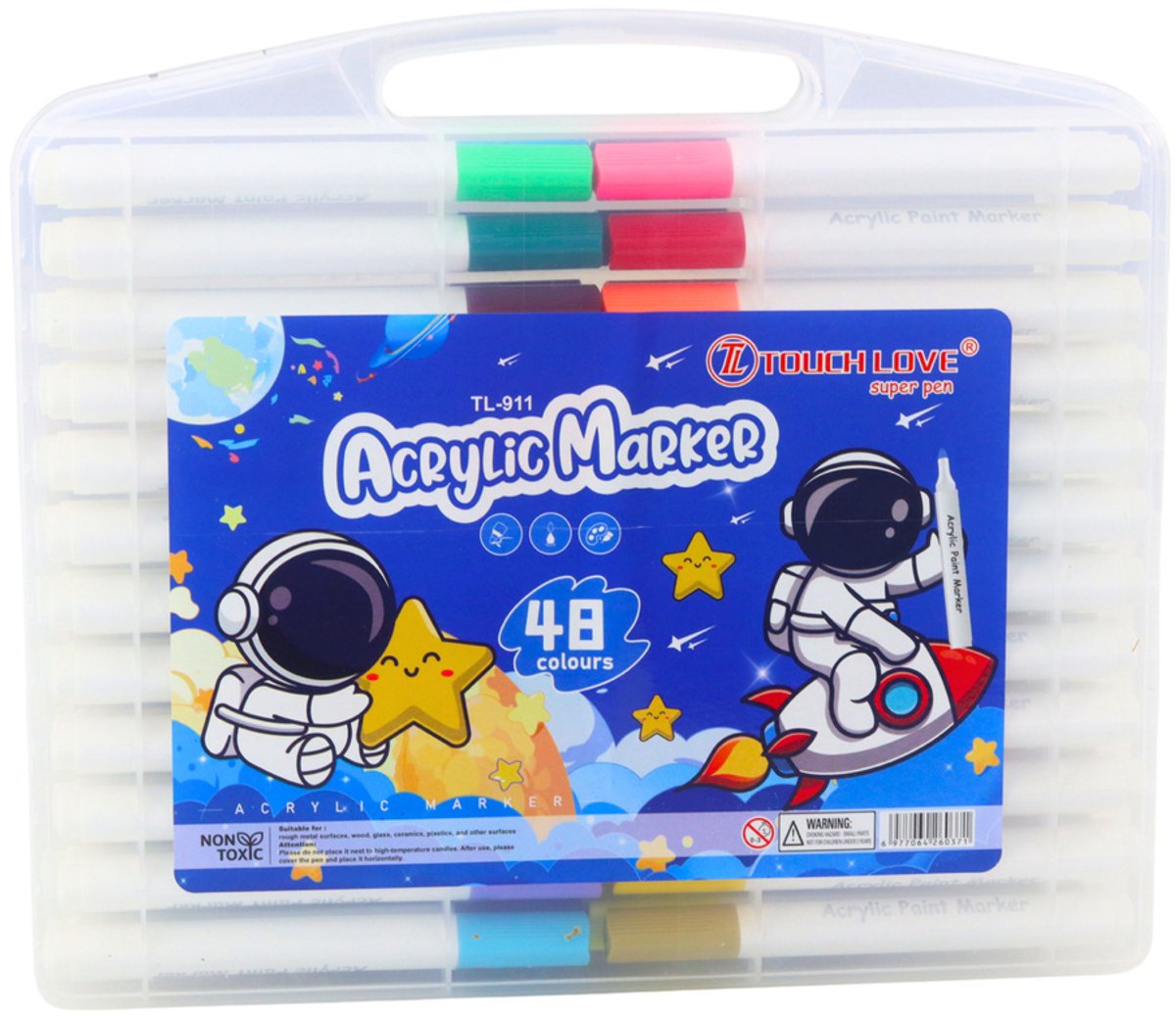 Ontdek de veelzijdige set acrylmarkers, ideaal voor jonge kunstenaars en kunstliefhebbers! Met deze hoogwaardige markers in 48 levendige kleuren kunt u unieke artistieke en decoratieve projecten tot leven brengen. Dankzij de acrylinkt zijn de kleuren niet alleen zeer intens en expressief, maar ook bestand tegen vervaging en slijtage. Ze dekken diverse oppervlakken zoals papier, karton, hout, plastic en glas perfect af, waardoor ze ideaal zijn voor zowel dagelijkse schetsen als professionele kunstwerken.