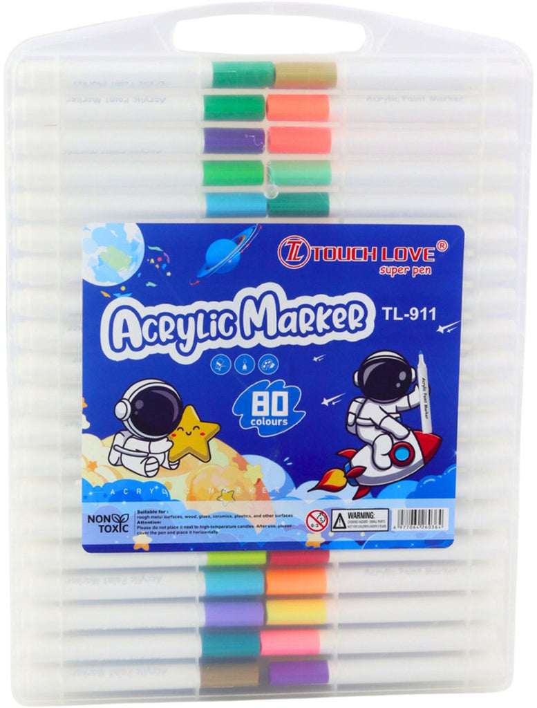 Ontdek de veelzijdige set acrylmarkers, ideaal voor jonge kunstenaars en kunstliefhebbers! Met deze hoogwaardige markers in 80 levendige kleuren kunt u unieke artistieke en decoratieve projecten tot leven brengen. Dankzij de acrylinkt zijn de kleuren niet alleen zeer intens en expressief, maar ook bestand tegen vervaging en slijtage. Ze dekken diverse oppervlakken zoals papier, karton, hout, plastic en glas perfect af, waardoor ze ideaal zijn voor zowel dagelijkse schetsen als professionele kunstwerken.