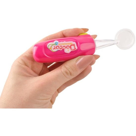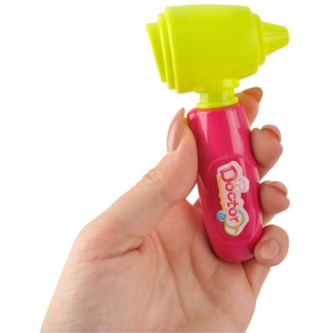 Bij indrukken piept de stethoscoop en gaat het hartvormige lampje branden. De thermometer en hartslagmeter hebben een schuifknop om de meting aan te passen en een verlicht display. De otoscoop en de tandspiegel zijn uitgerust met verlichting.