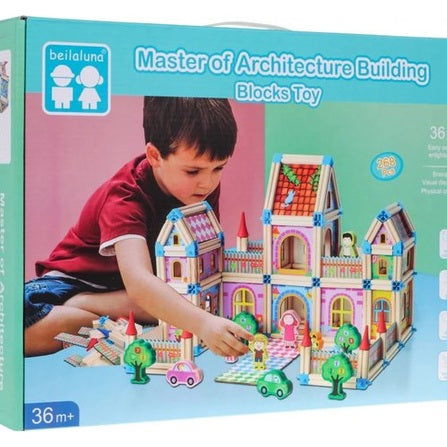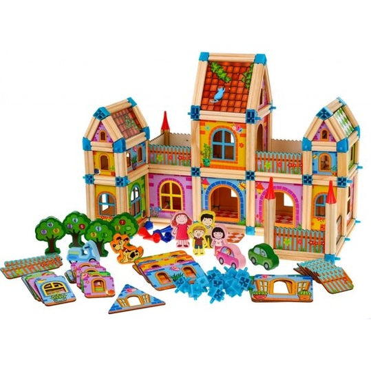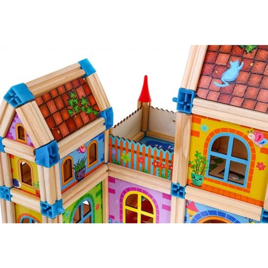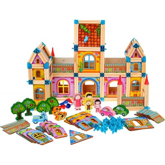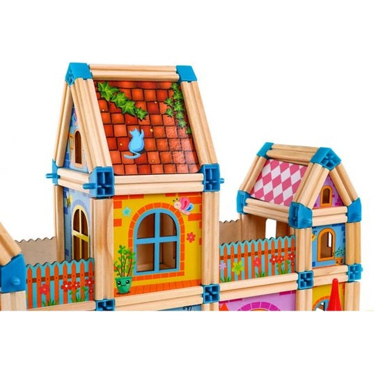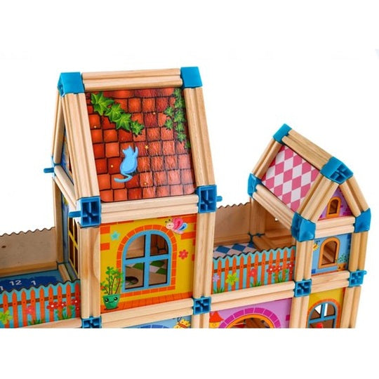 Het pakket bestaat uit 268 elementen waarmee je kleurrijke houten huizen kunt bouwen. Naast de bouwelementen bevat de set ook boomvormige blokken met personages of auto's, er is tevens ook een instructie met pictogrammen.