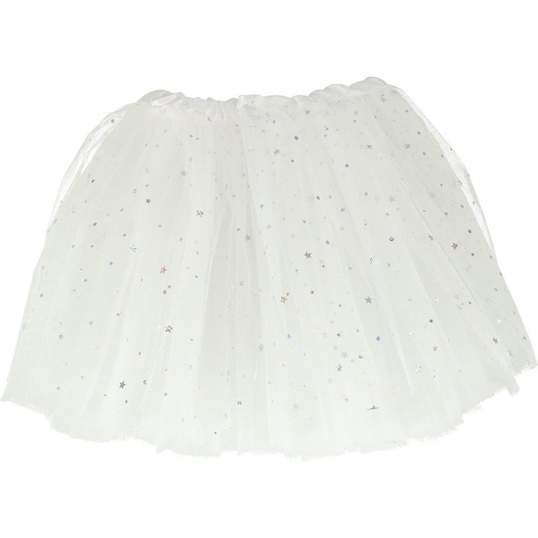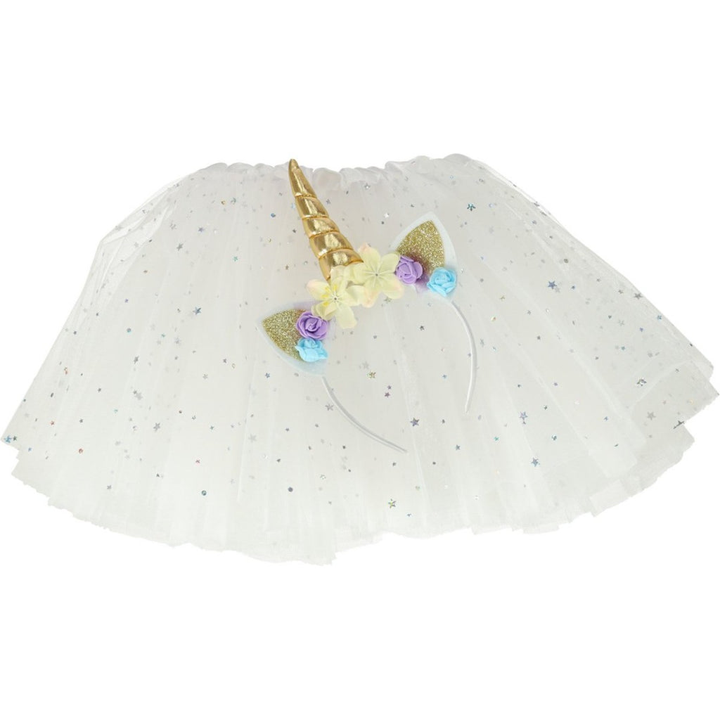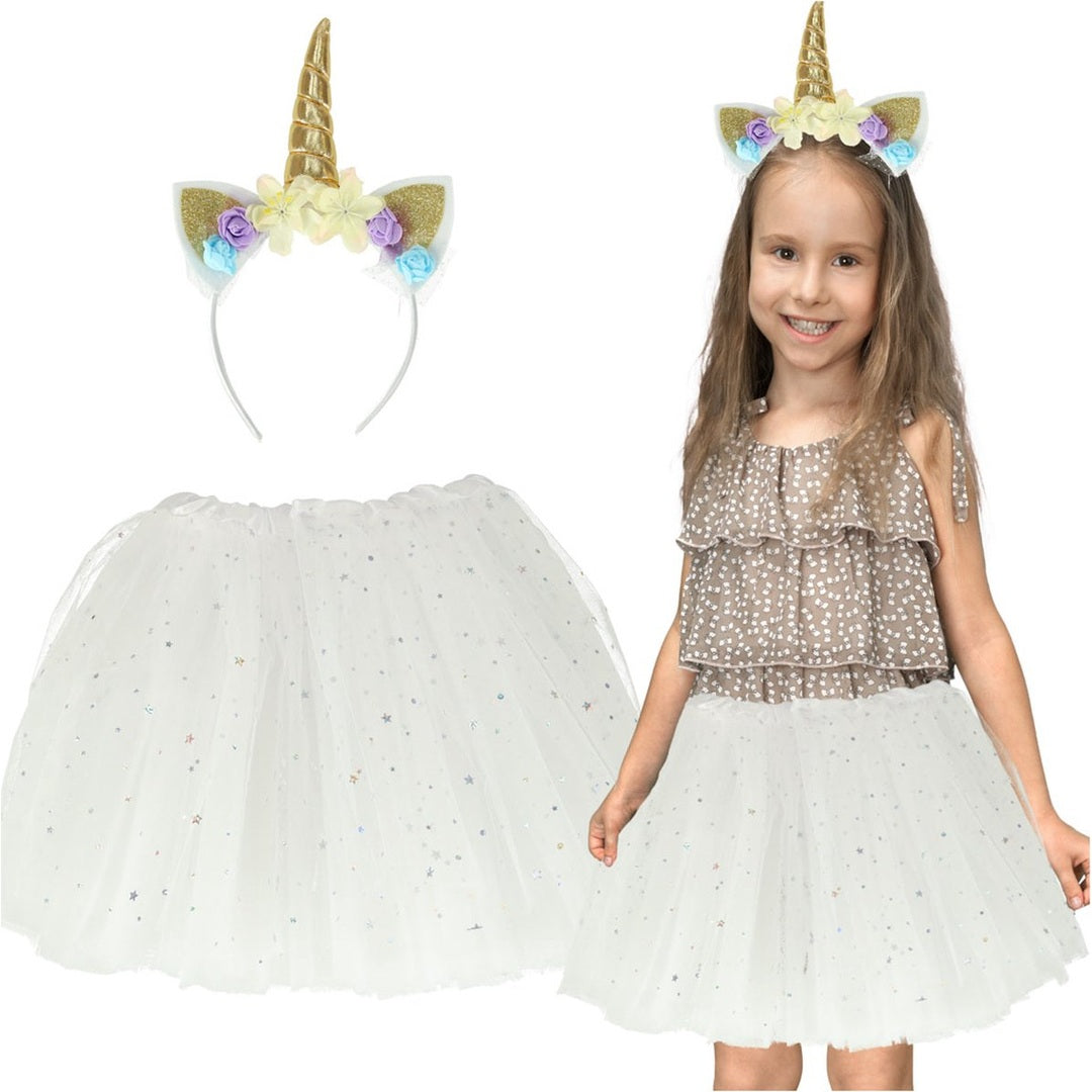Een carnvavalskostuum bestaande uit een eenhoorn haarband en witte prinsessenrok bedekt met fonkelende sterren. Bestaat er een magischere combinatie?