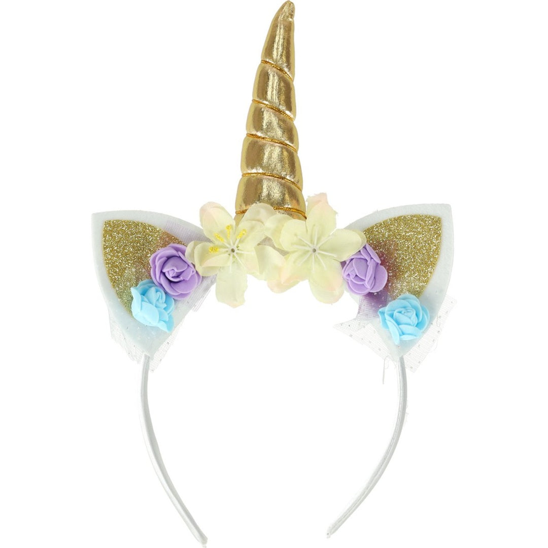 De goudkleurige eenhoorn haarband is afgezet met roze glanzende stof en versierd met een zachte hoorn en oren met glitters.