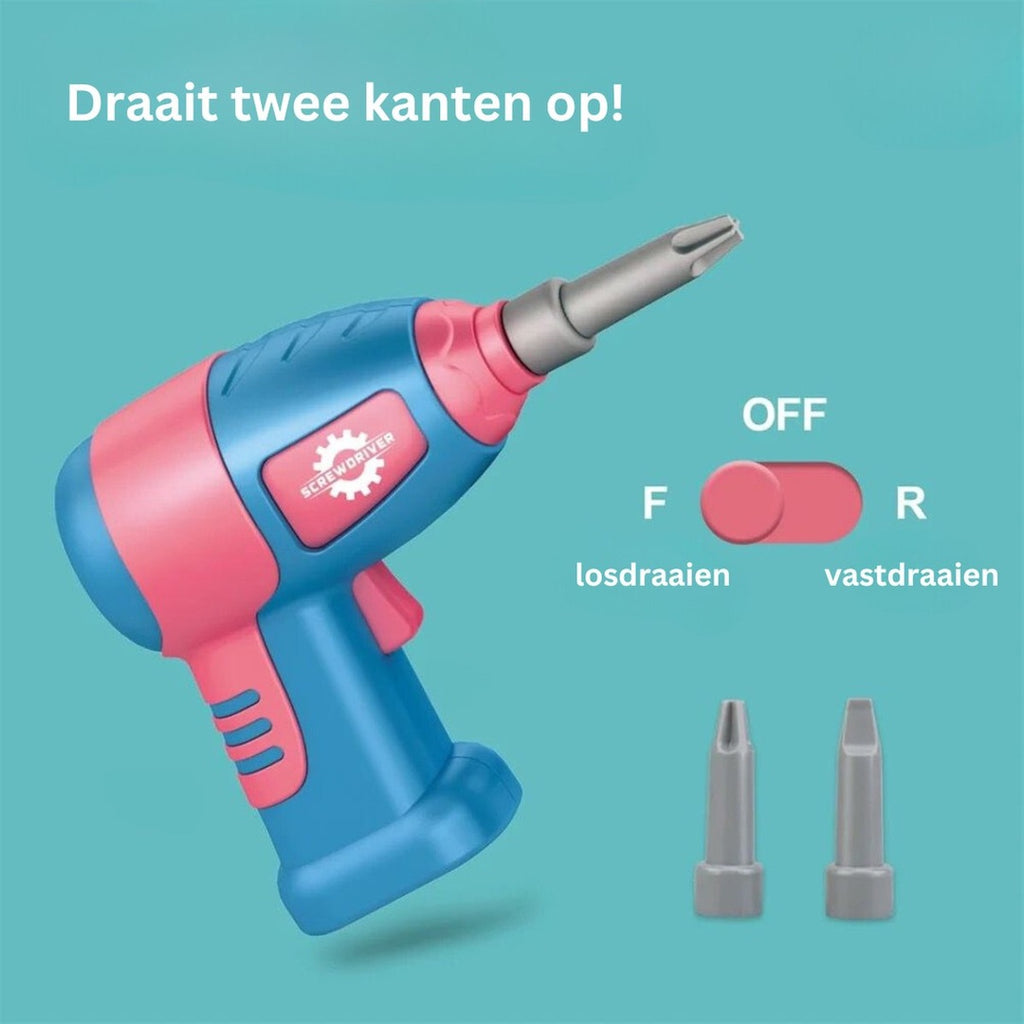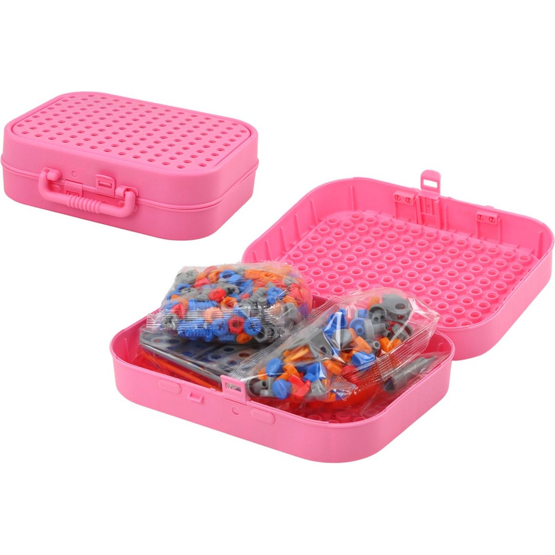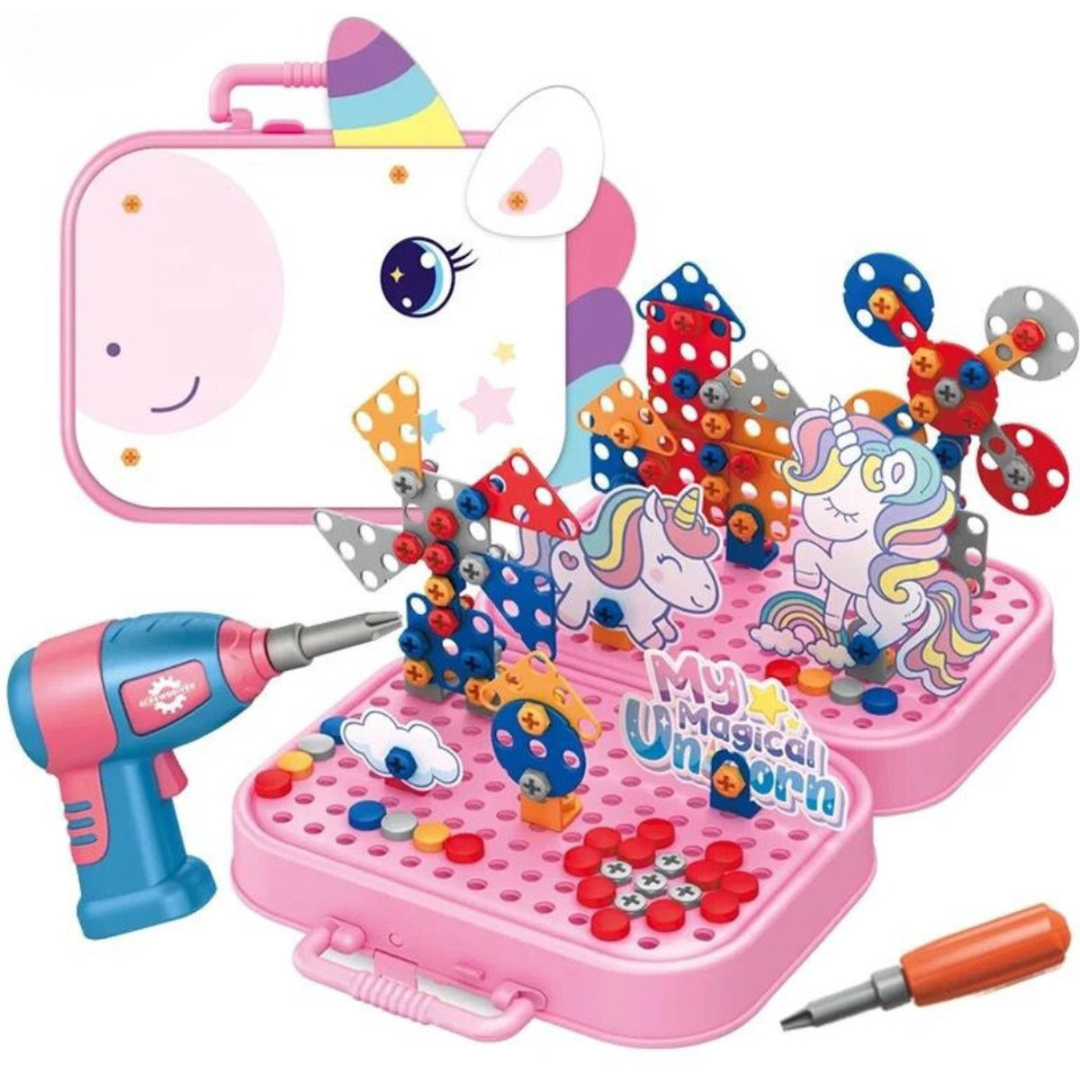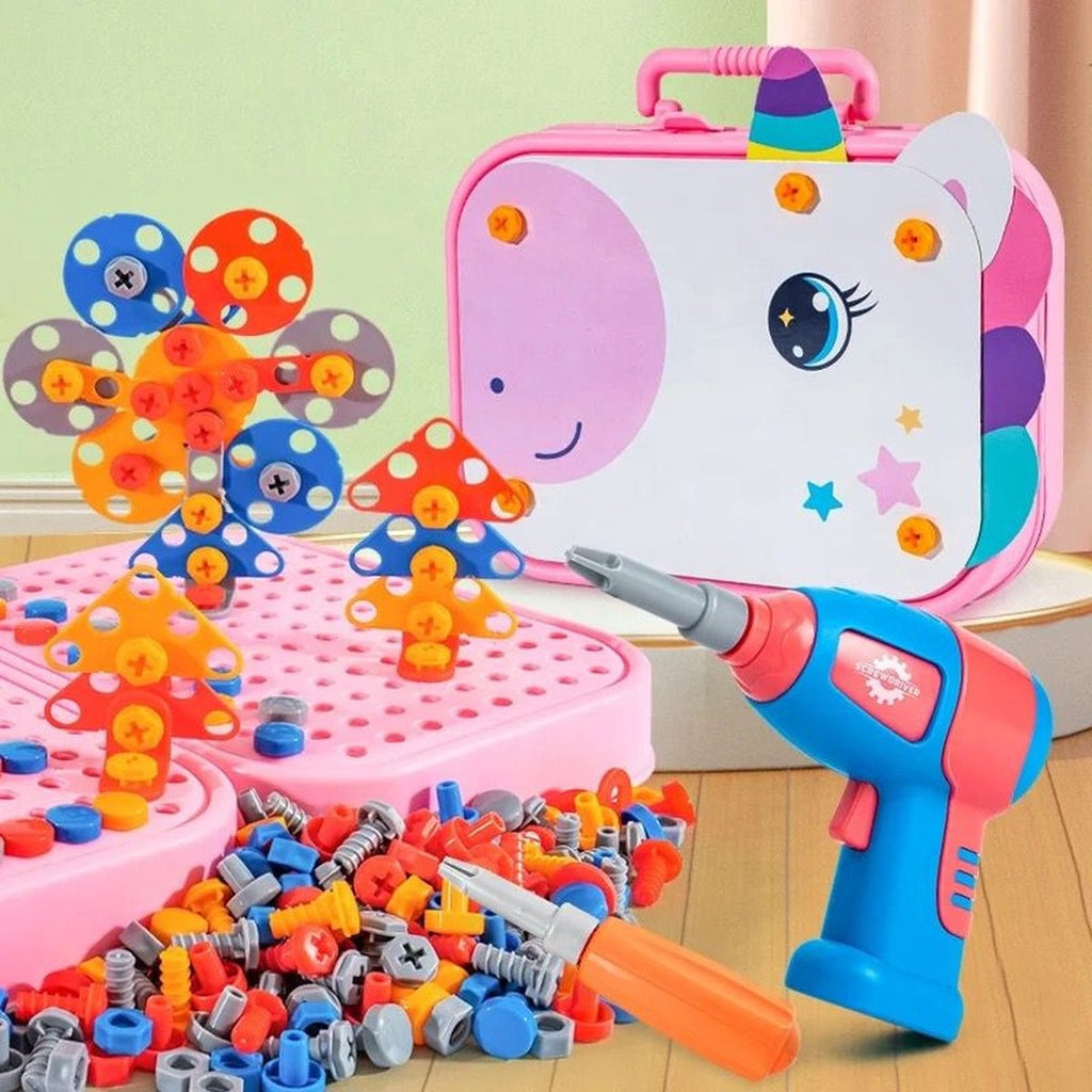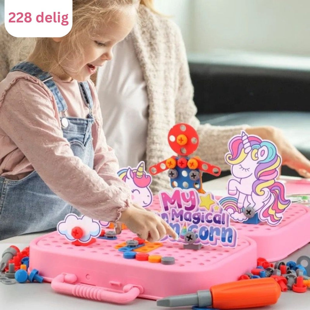 De doe-tafel is roze van kleur, waardoor het een magische uitstraling heeft die past bij het thema van de eenhoorn, en de geometrische vormen en schroeven zijn er in oranje, grijs, blauw en rood, wat variatie en interesse toevoegt aan het spel.
