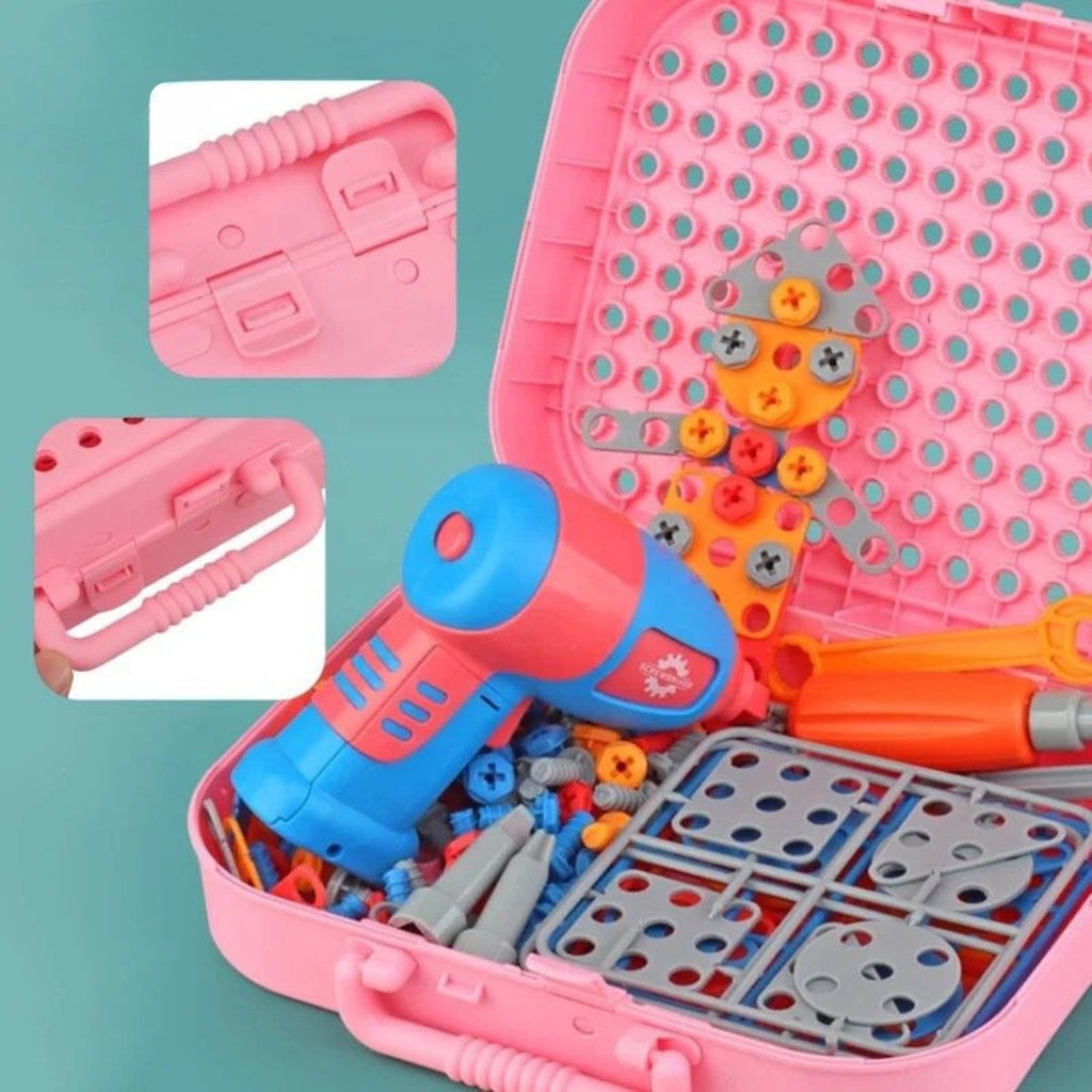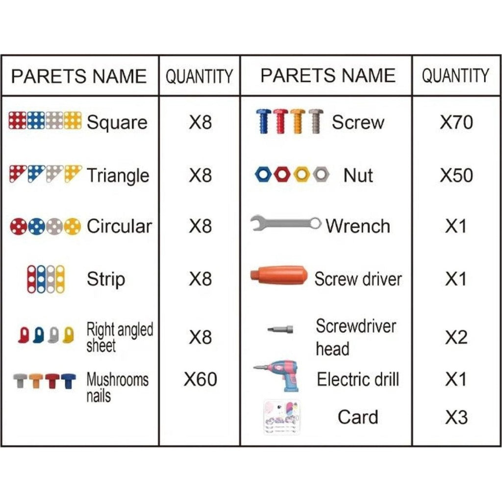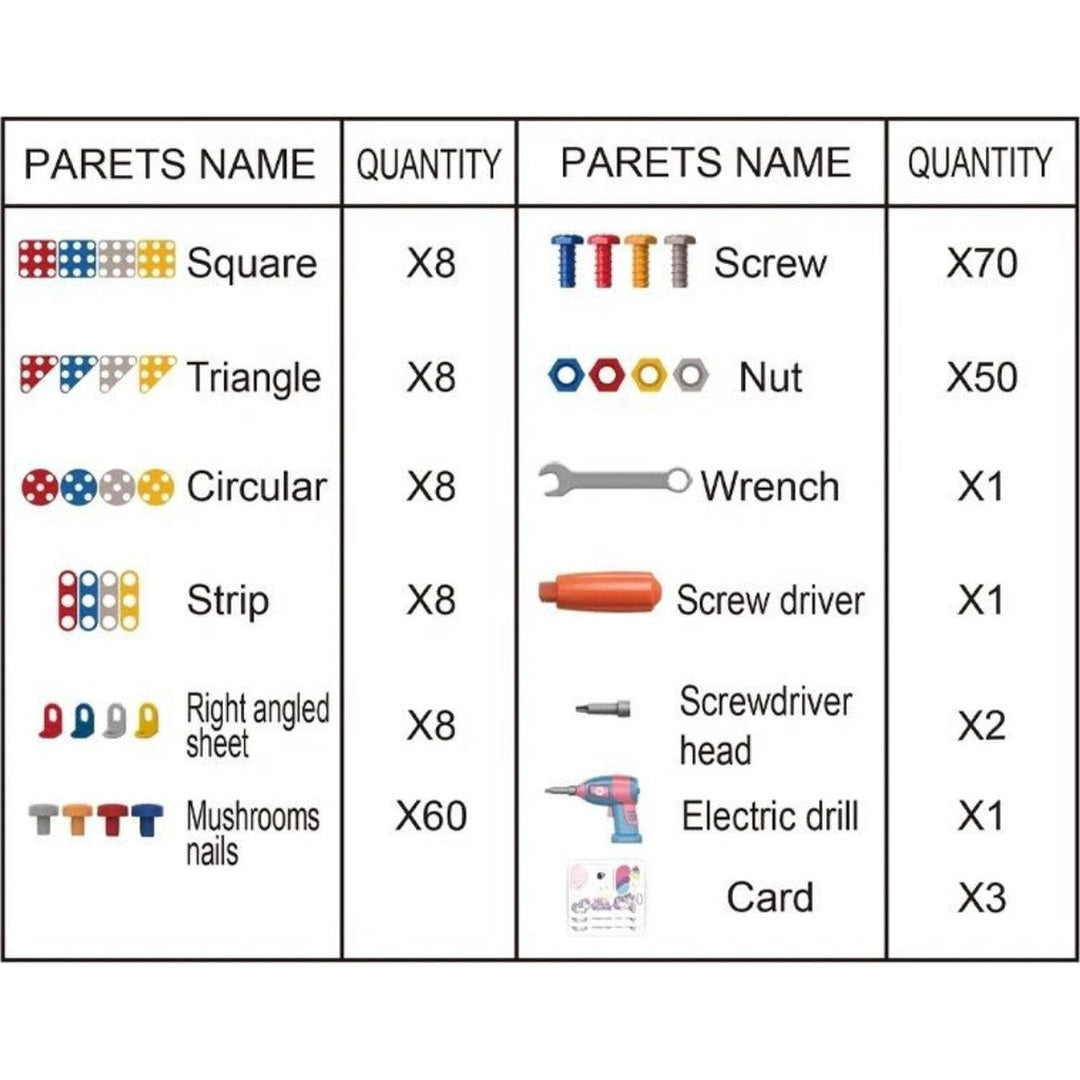 De set bevat een combisleutel, een schroevendraaier en een ruime keuze aan schroeven en moeren waarmee de elementen gemakkelijk gemonteerd en gedemonteerd kunnen worden. Dit is een uitstekende gelegenheid om handvaardigheid en logisch denken te ontwikkelen bij het bouwen van je eigen kunstwerken.