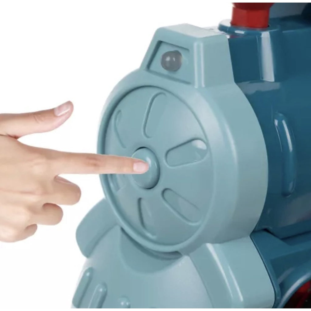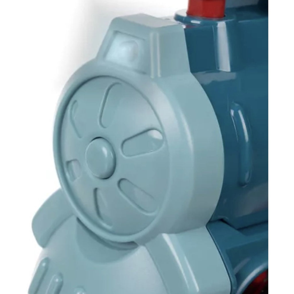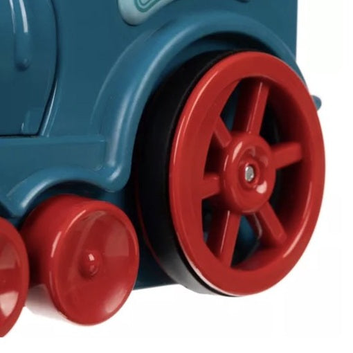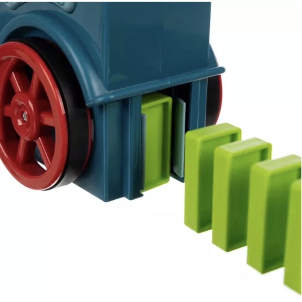 Kleurrijke interactieve locomotief die dominoblokken stapelt. De locomotief rangschikt blokken in vaste intervallen en signaleert dit telkens met een bel. De richting van de trein kan worden ingesteld met behulp van de schoorsteen.