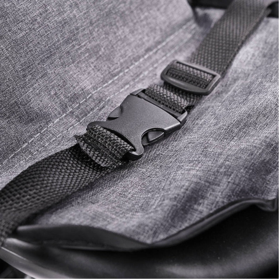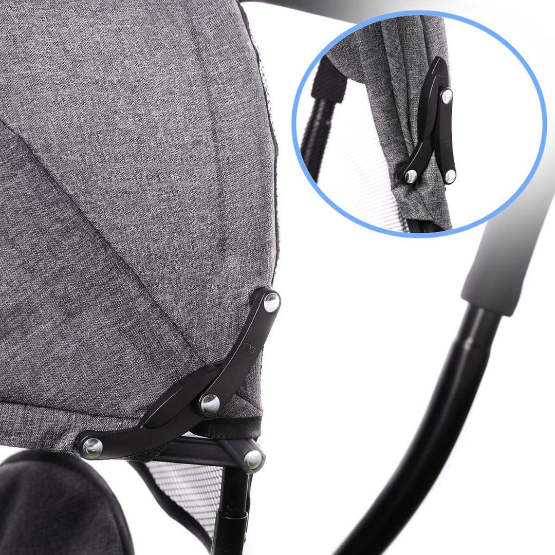 De fiets is uitgerust met een opvouwbare, 3-traps mesh luifel, die beschermt tegen de zon en de regen (hij kan worden verwijderd). Je kunt de opgevouwen kap eenvoudig vastzetten met een gesp.