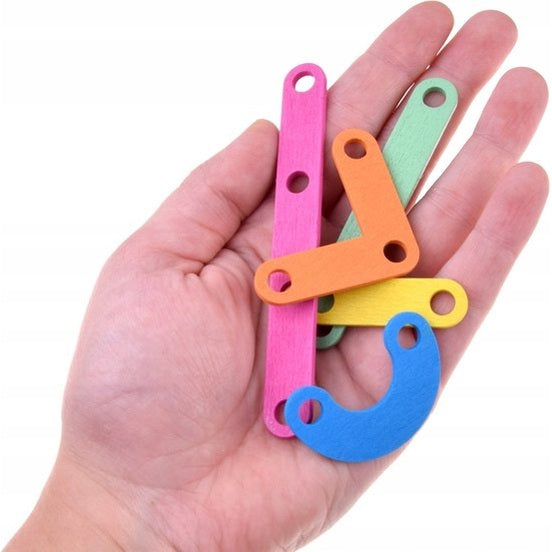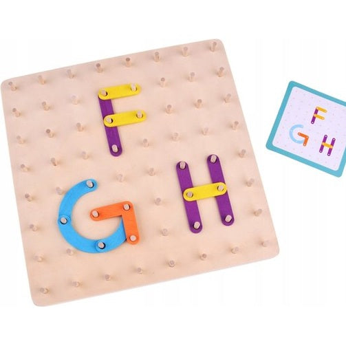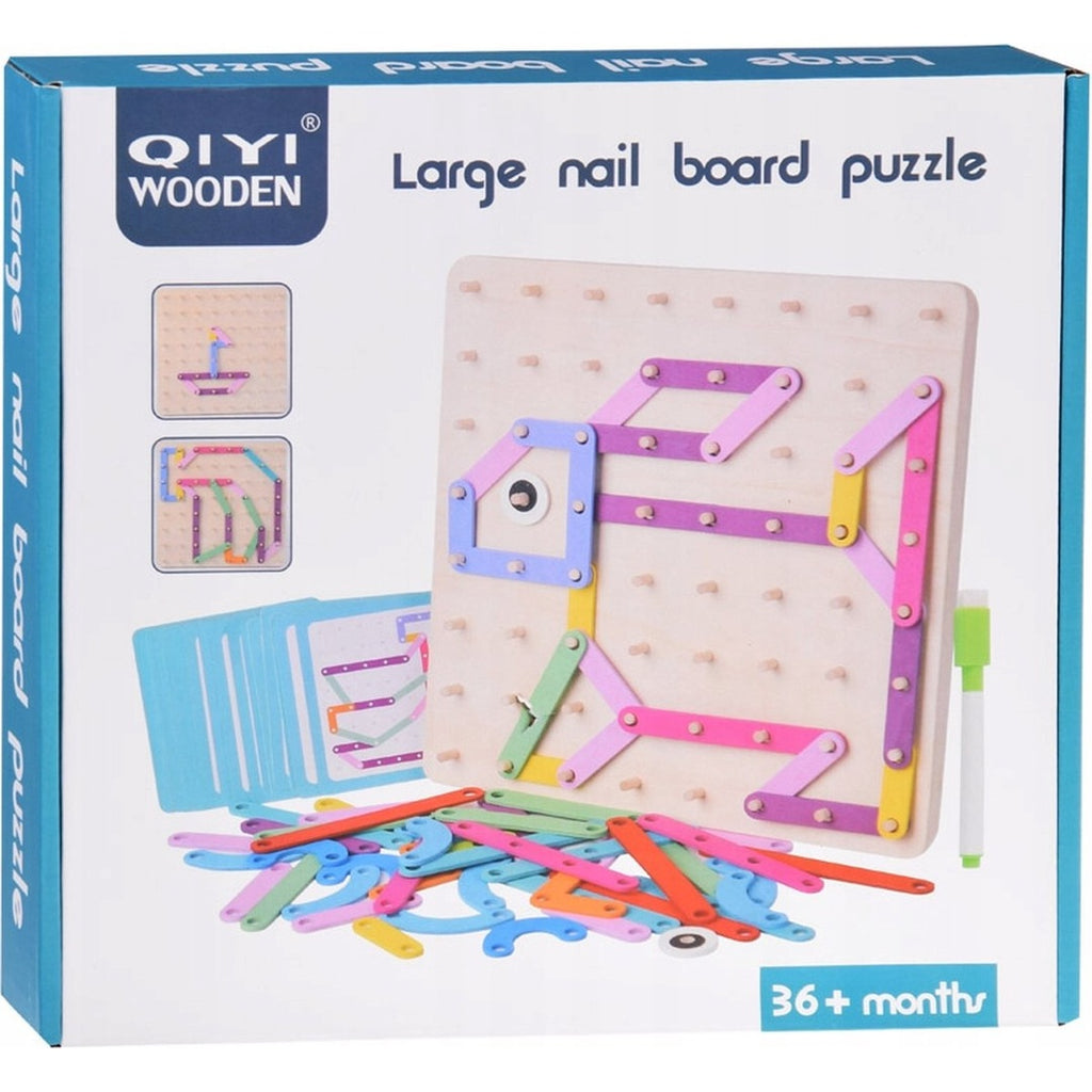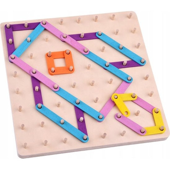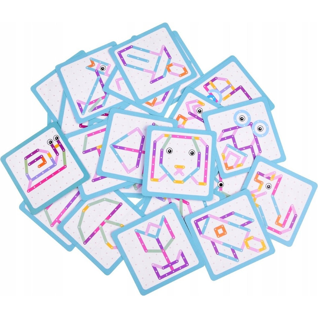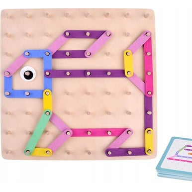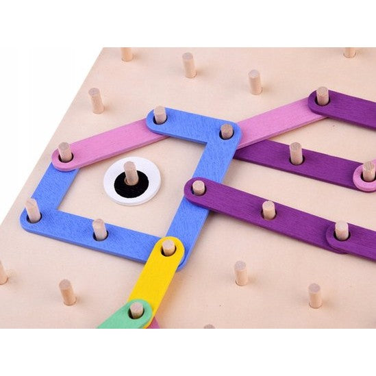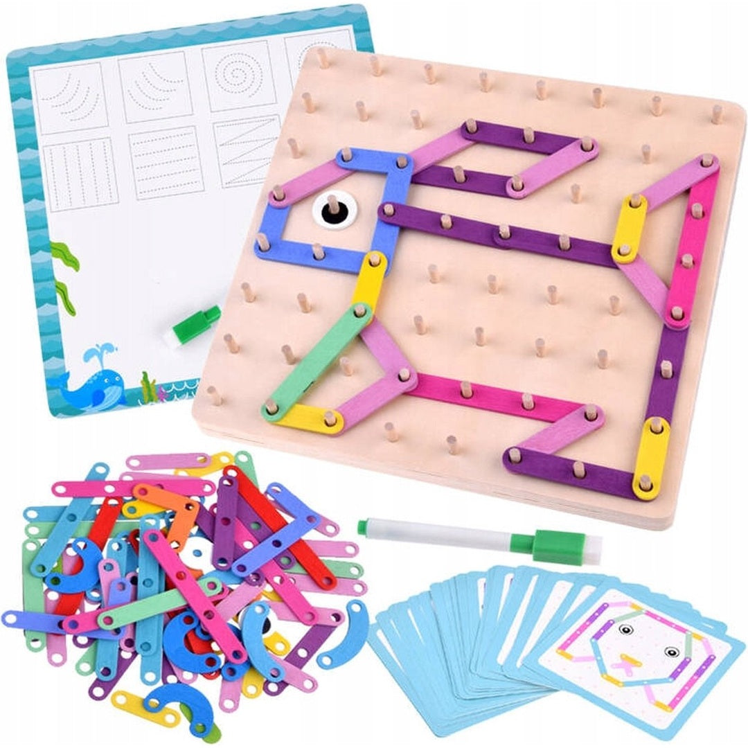 Het houten bord is dubbelzijdig. Aan de ene kant is er een bord voor het schrijven en tekenen van de sjablonen met een uitwisbare stift. Een sponsmarker is inbegrepen in de set. Aan de andere kant is een plank met houten pinnen waarop stokjes van verschillende kleuren en lengtes met gaatjes worden geplaatst, zodat de afbeelding op de kaart wordt gereproduceerd.