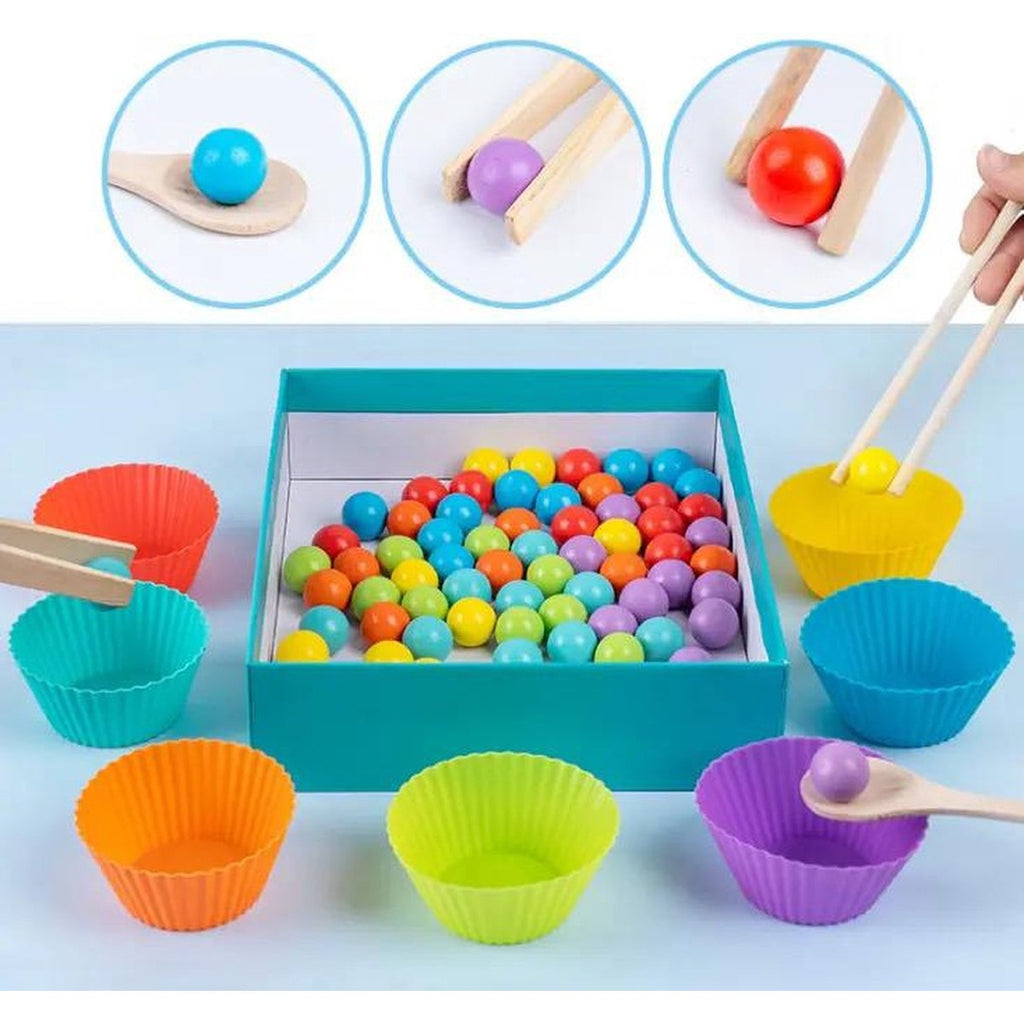 Het is leuk om afbeeldingen te ordenen met behulp van veel ballen van verschillende kleuren. Met de siliconen bakjes kun je de ballen sorteren. De set bevat ook afbeeldingen die je kunt maken met de elementen in de set. Hoe rangschik je de ballen? Maak gebruik van bestek, eetstokjes of een tang om de motoriek verder te ontwikkelen.
