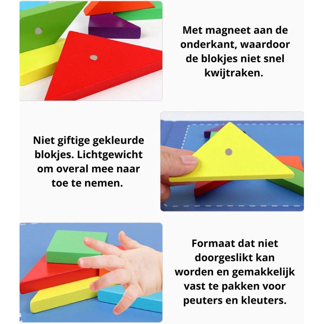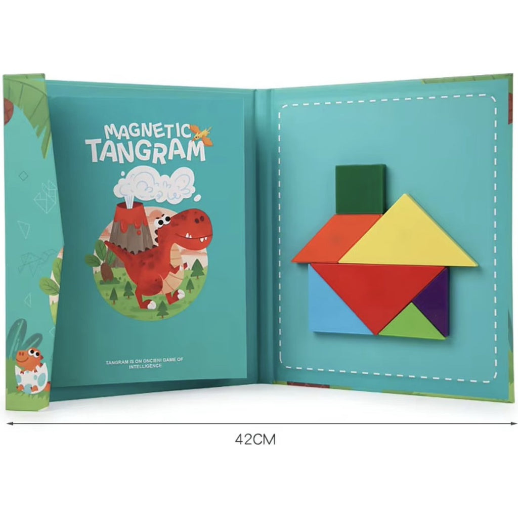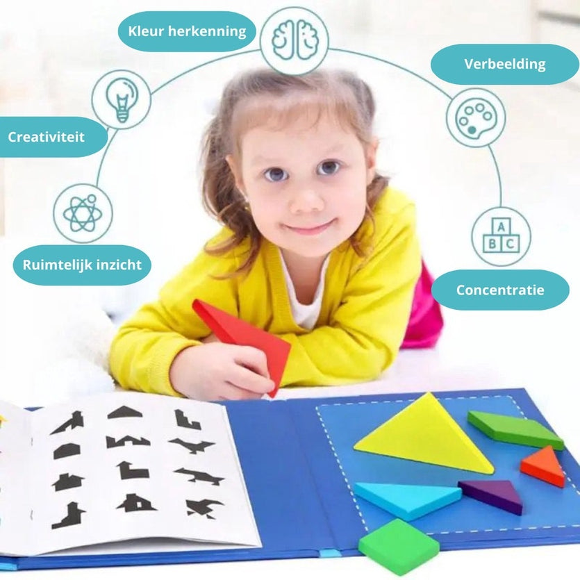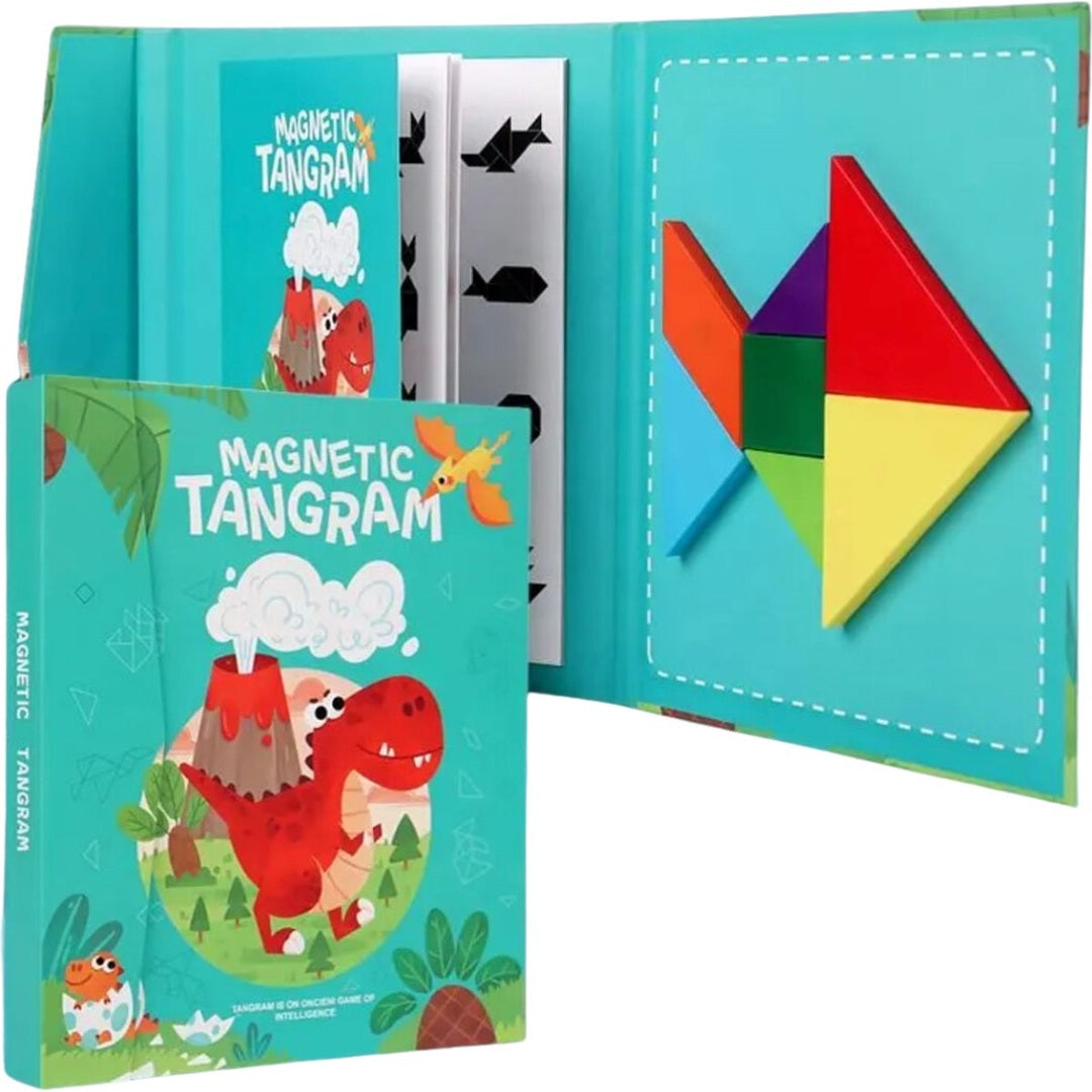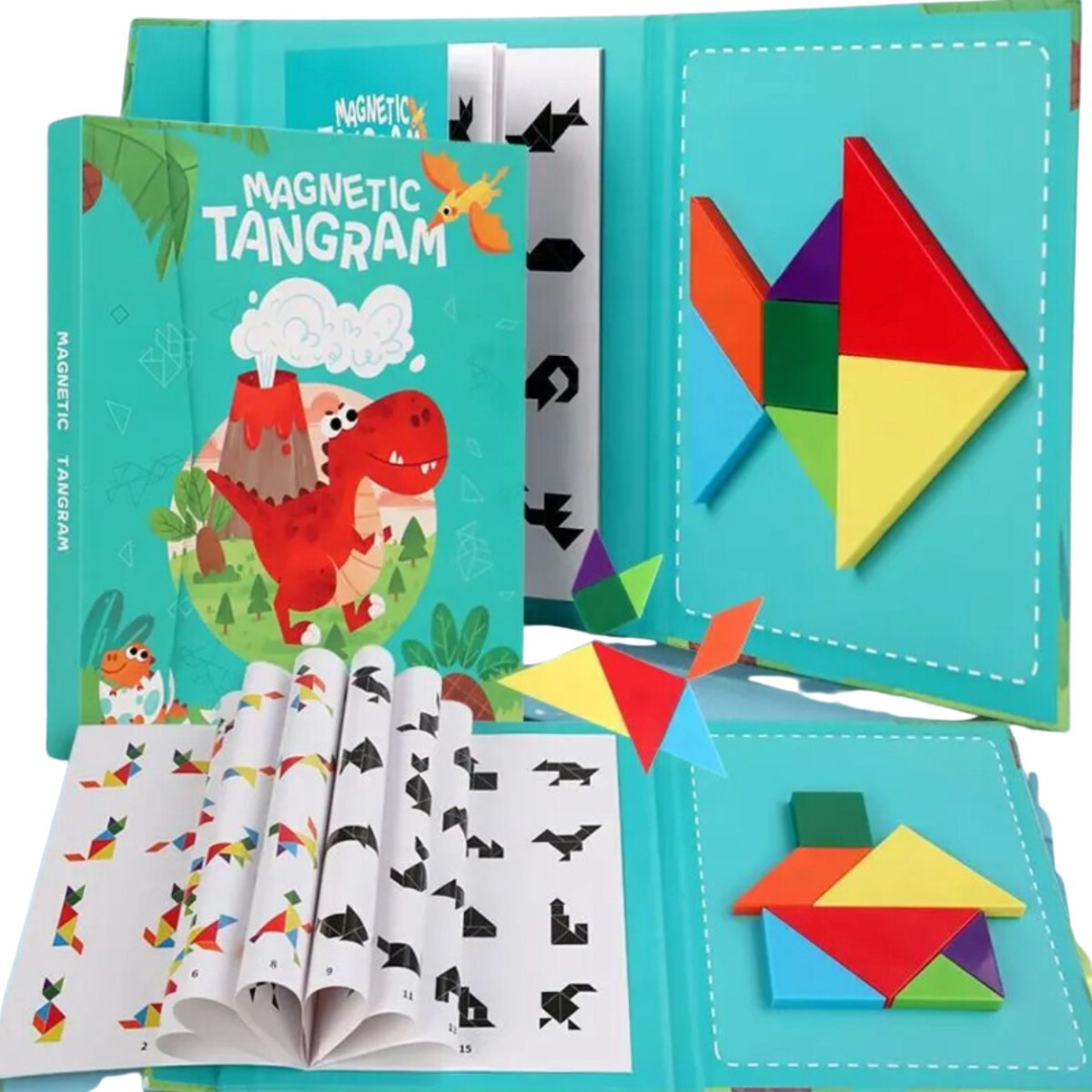 Tangram-puzzels bieden peuters, kleuters en ouders uren speelplezier. Het magnetische puzzelboek combineert leren en spelen op een gemakkelijke manier voor peuters en kleuters. Het boek bevat 7 kleurrijke magneetvormen en vele uitdagende puzzels voor eindeloos plezier en leren.