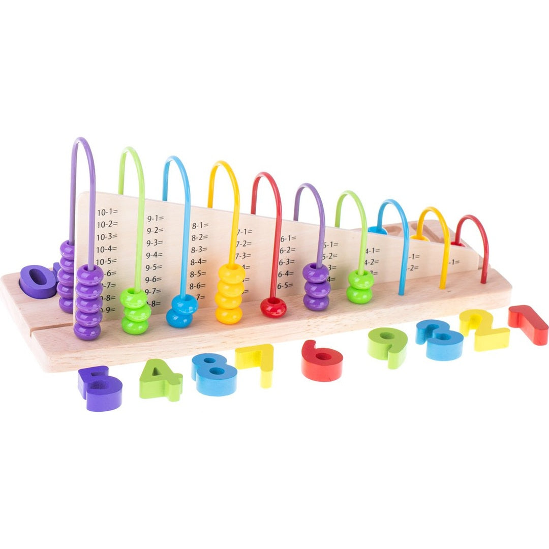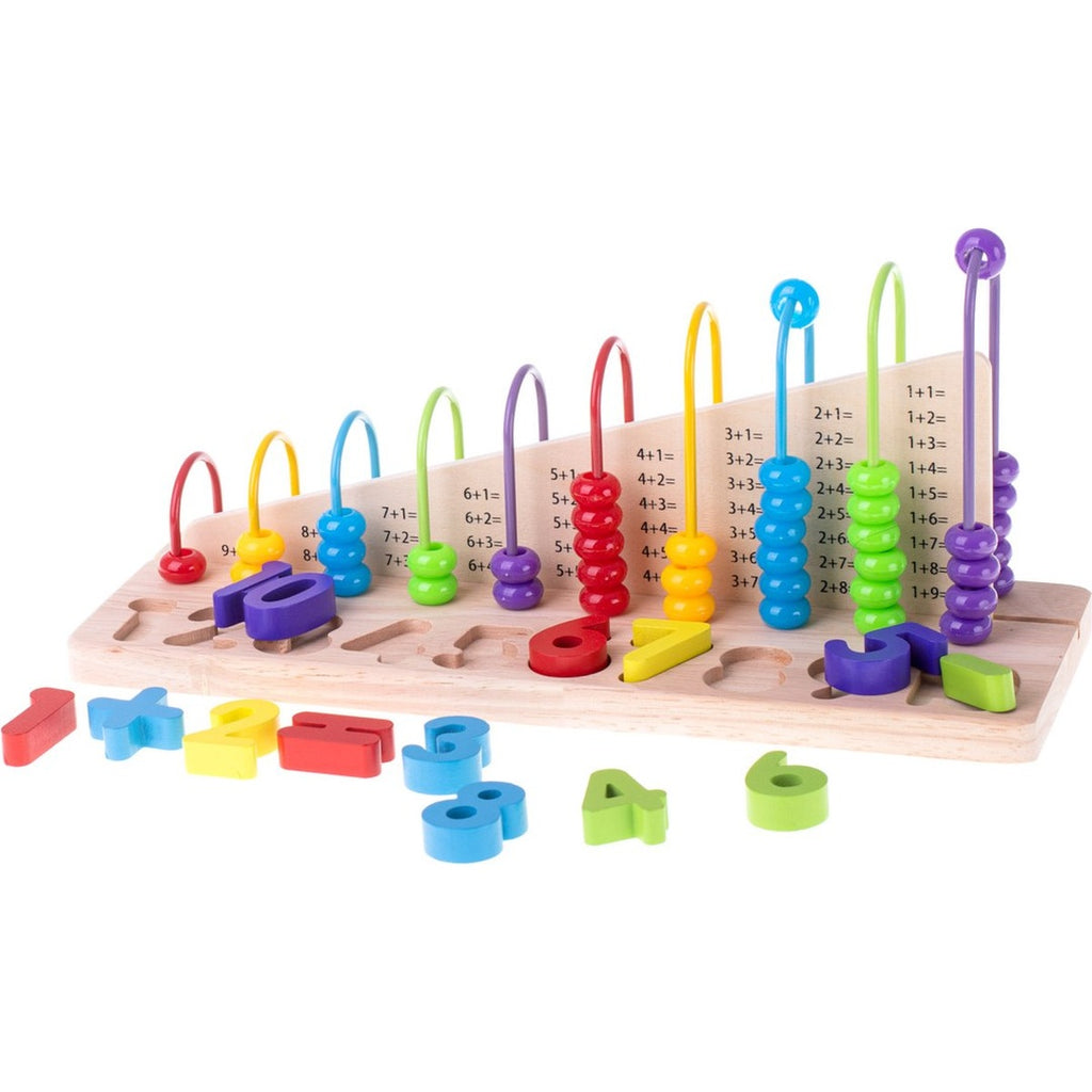 Het telraam staat op een stevige houten voet. Aan de ene kant van het telraam staan sommen met optellen, en aan de andere kant met aftrekken.