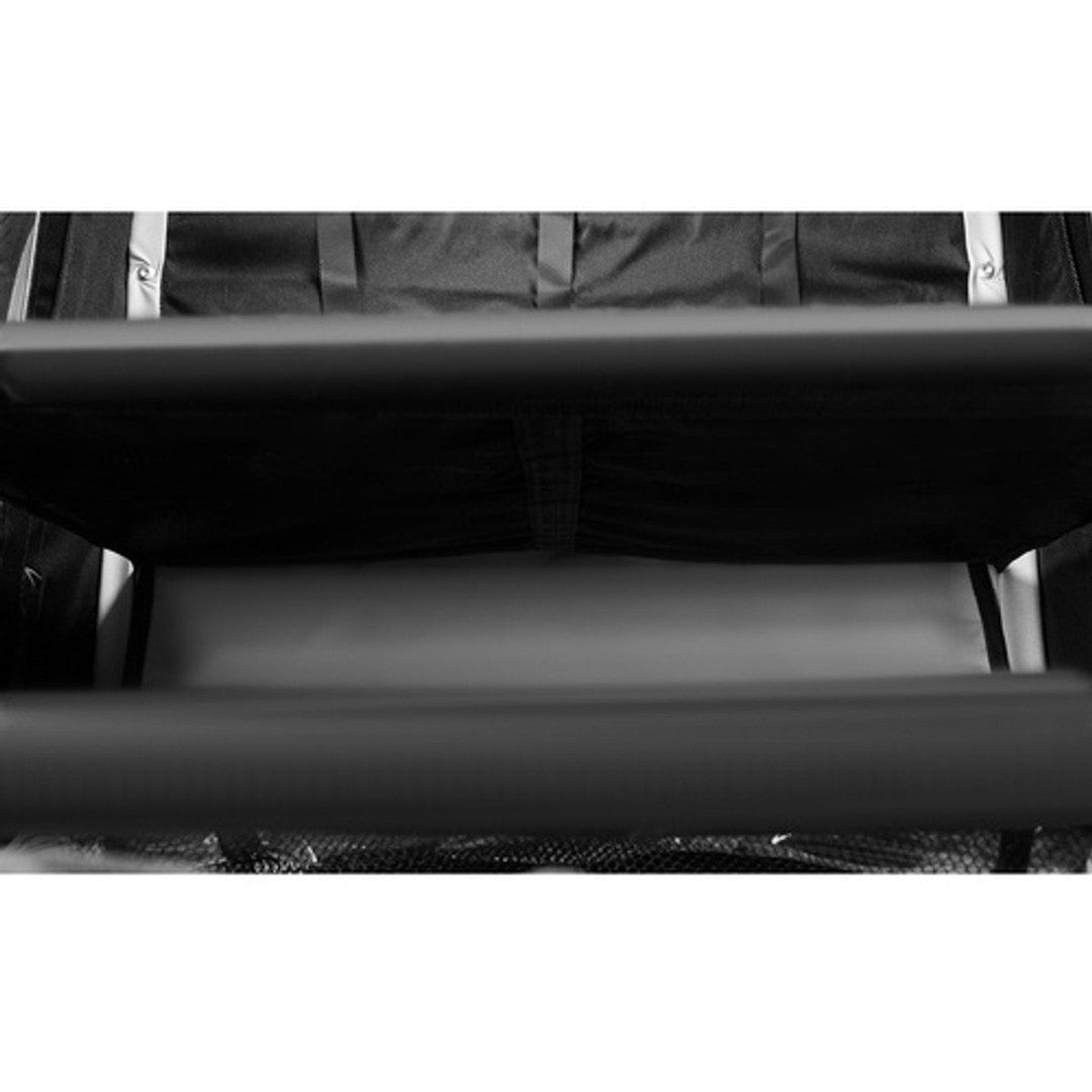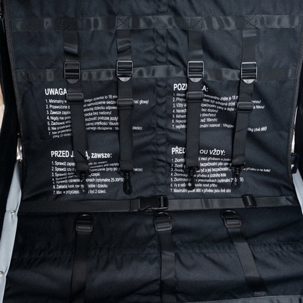 Voor 2 kinderen – de ruime en comfortabele aanhangwagen biedt plaats aan twee kinderen (of één met meer bagage), met een brede zitplaats met veiligheidsriemen, ramen met folie, deuren met een muggennet en folie, en een ruime cabine die beschermt tegen wind en regen.