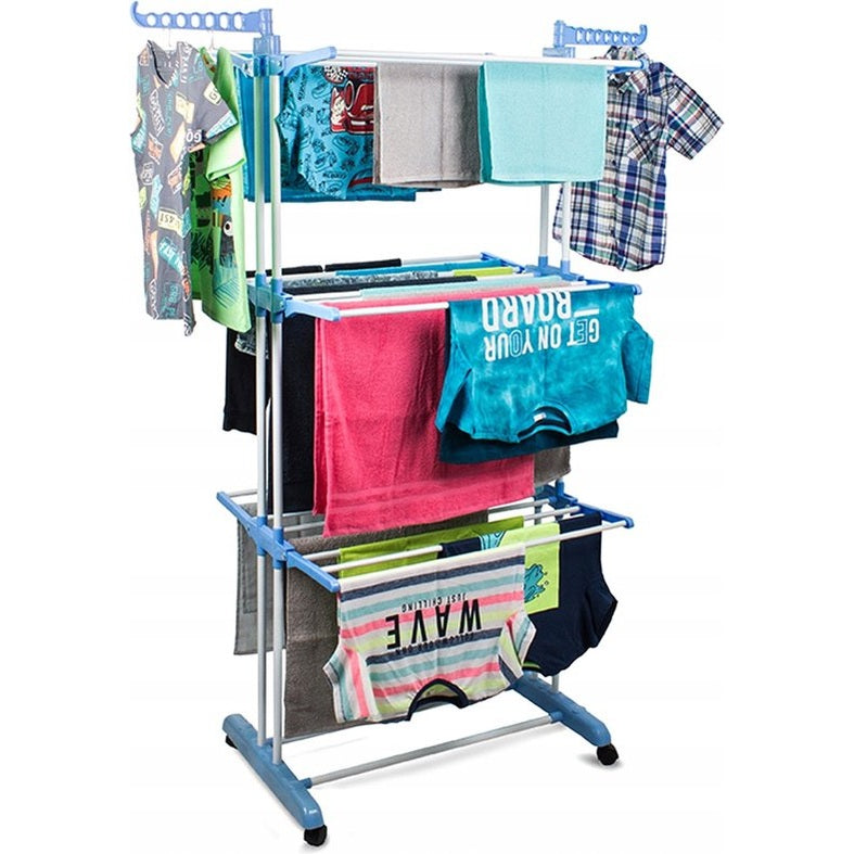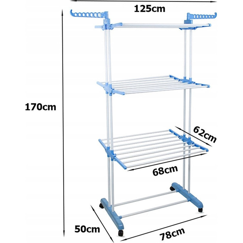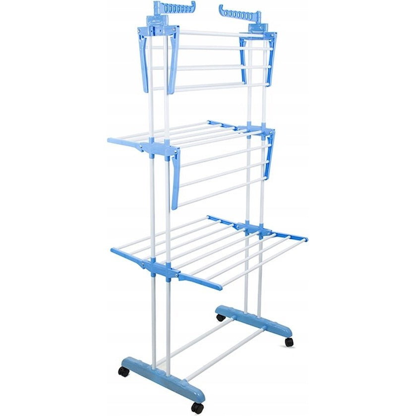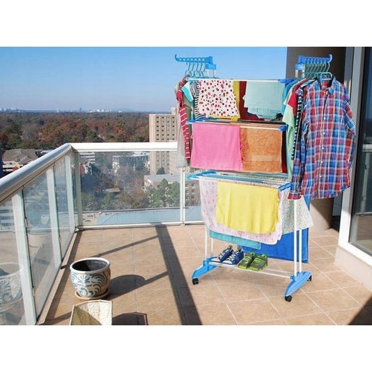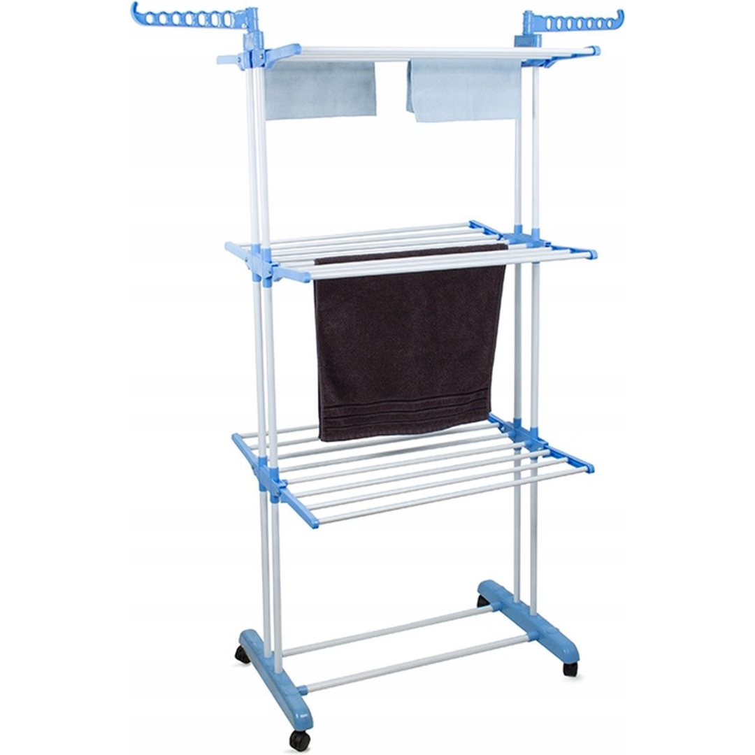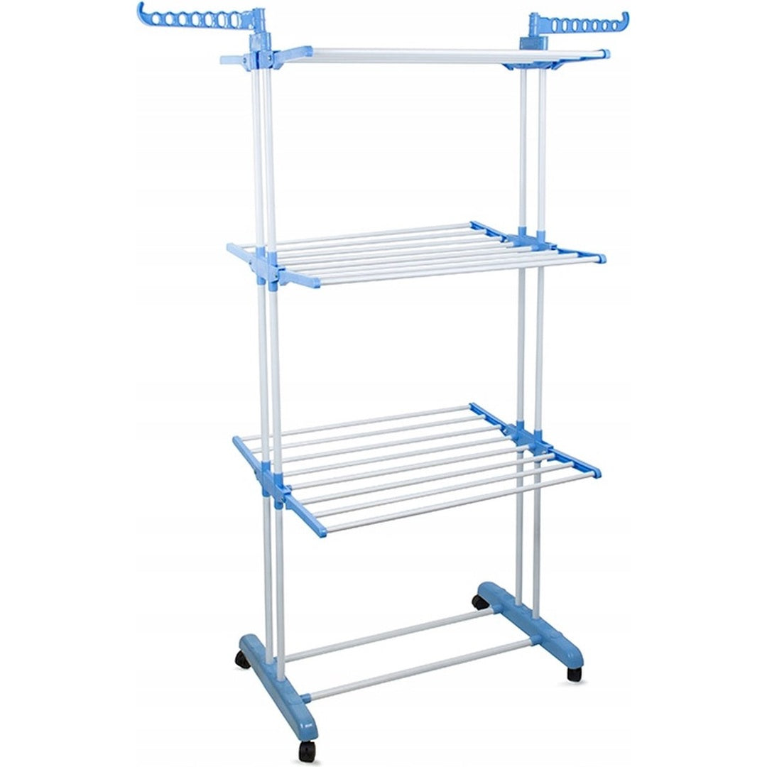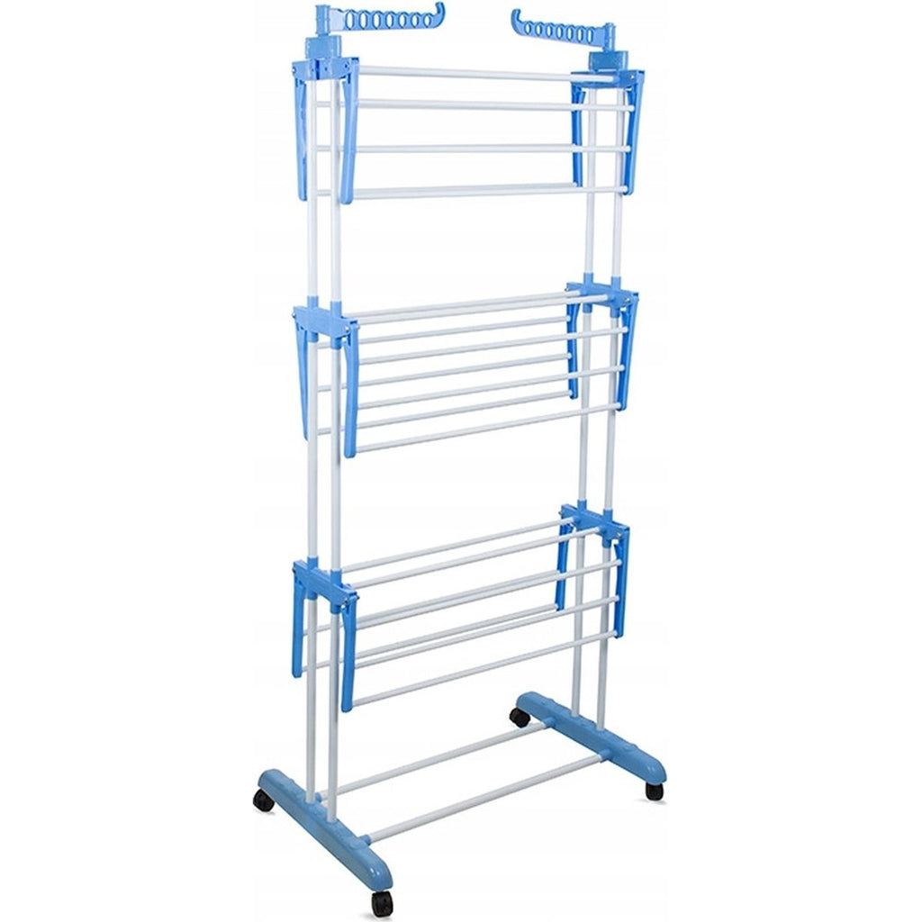 De stevige staande wasdroger is de ideale oplossing. Uitgeklapt neemt hij weinig ruimte in beslag en het droogoppervlak is ongeveer 17 strekkende meter. Bovendien heeft hij twee bevestigbare armen waaraan in totaal 14 kledinghangers kunnen worden opgehangen.