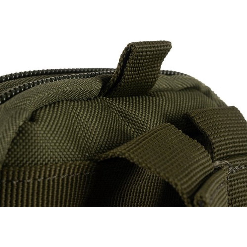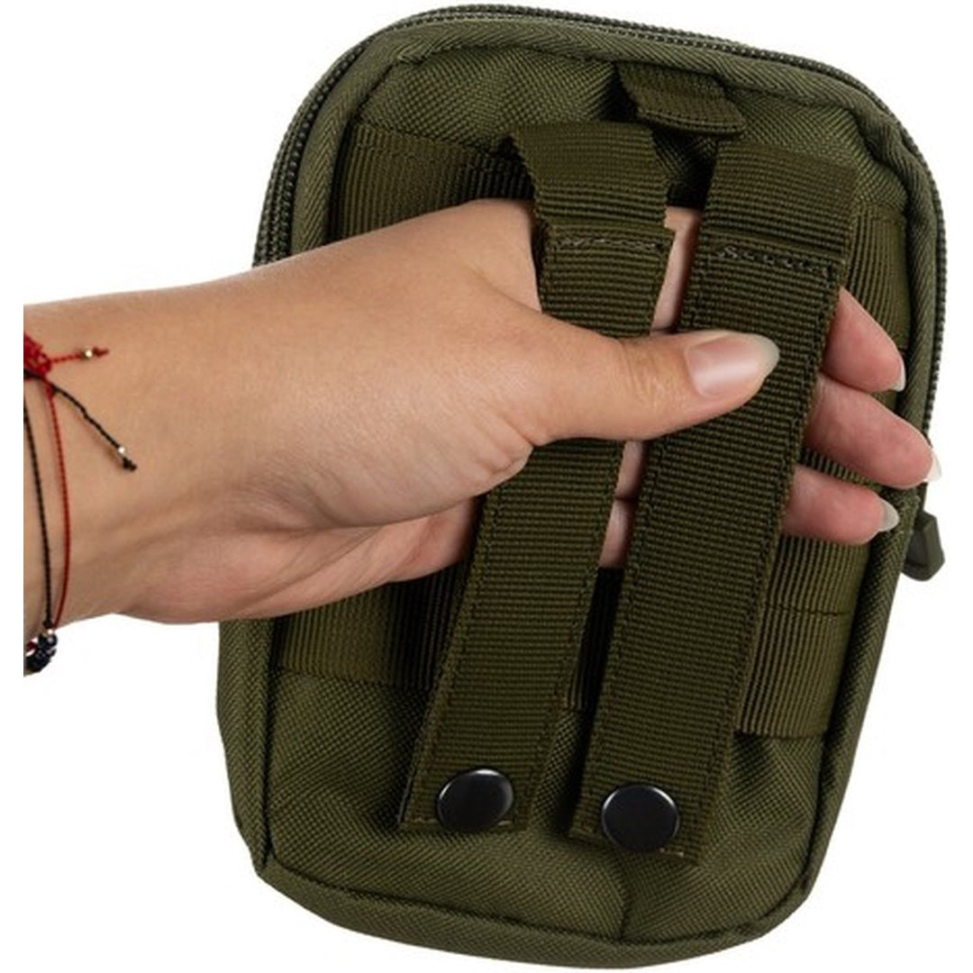 • Flexibele bevestiging - de tas is ontworpen met het MOLLE-systeem (Modular Lightweight Load-carrying Equipment) in gedachten, waardoor de tas flexibel kan worden bevestigd aan verschillende tactische uitrusting zoals rugzakken, riemen of vesten. Aan de achterkant van de tas zitten twee verstevigde riemen die worden vastgemaakt met sterke metalen drukknopen, die de tas extra beschermen tegen verschuiven tijdens gebruik. Aan de achterkant van de tas zitten twee rijen horizontale riemen met drie secties op elk van de stroken, waardoor de tas kan worden aangepast aan de breedteriem of andere uitrusting. Deze innovatieve oplossing verhoogt de functionaliteit van de tas, waardoor deze ideaal is voor dynamische situaties.