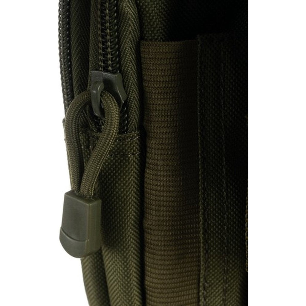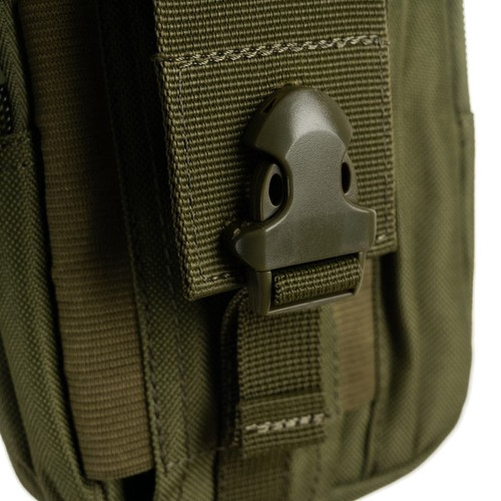 • Functioneel - de tas is uitgerust met twee hoofdcompartimenten die worden afgesloten met ritsen met comfortabele ritsen, waardoor de inhoud snel toegankelijk is. Elk compartiment bevat een extra binnenvak, ideaal voor het opbergen van kleine spullen zoals sleutels of documenten. Aan de voorkant bevindt zich een speciaal vak voor de telefoon, bevestigd met een rits en een verstelbare riemgesp van duurzaam PP-materiaal (polypropyleen), dat stabiliteit en veiligheid van het apparaat garandeert. Naast dit vak is ruimte voor een pen of een dunne zaklamp, wat erg praktisch is in tactische omstandigheden. Aan de achterkant van de tas zitten twee verstevigde riemen bevestigd met sterke metalen drukknopen, die de tas extra beveiligen tegen wegglijden tijdens gebruik.