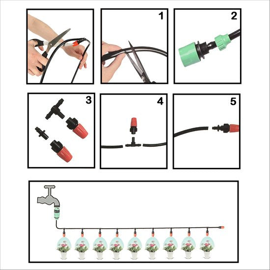 Sluit de sproeikabel gewoon aan op je tuinslang of kraan en geniet van een zachte nevel om je dag af te koelen!