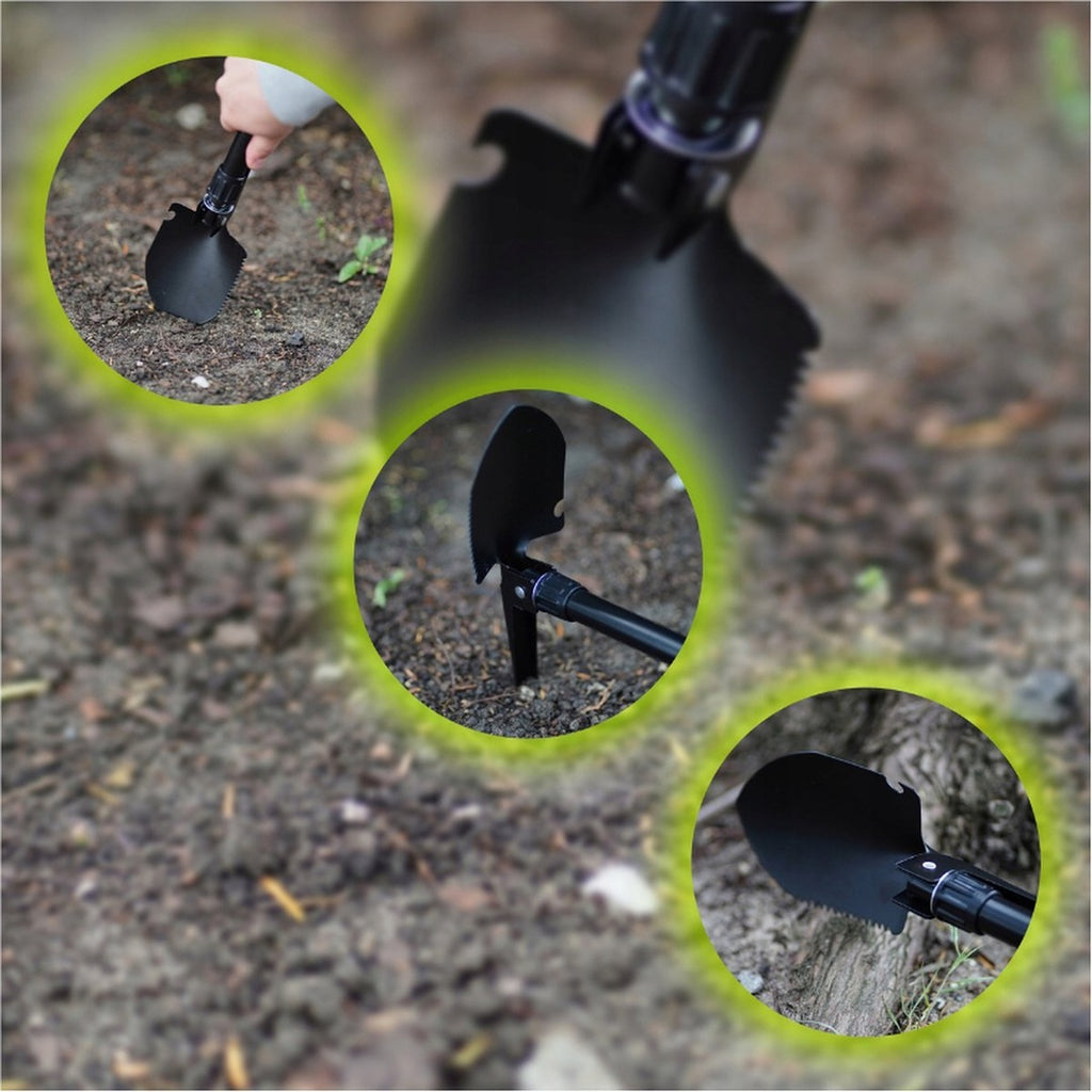 De multifunctionele 7-in- 1 schep is een handig hulpmiddel voor grondwerken in de tuin, kamperen, lichaamsbeweging, survival, vissen of als auto-accessoire.