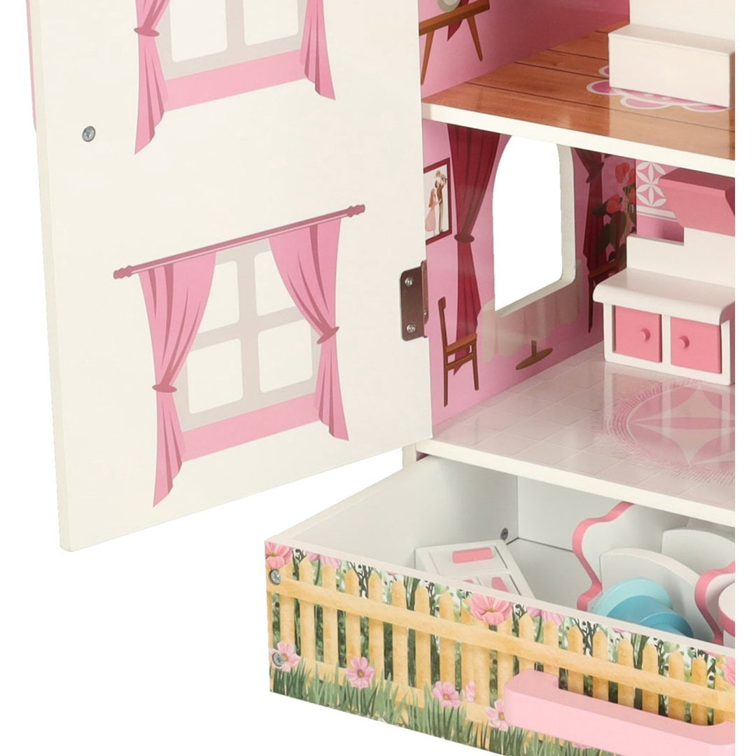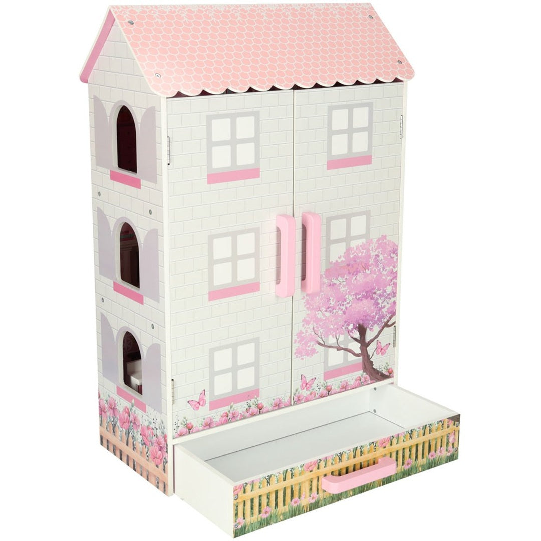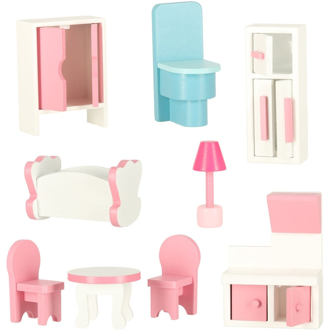 De set wordt geleverd inclusief een selectie van meubeltjes, zoals een keuken, lamp, wieg, twee stoelen, tafel, toilet, kast en ladekast. Het huis heeft een afsluitbare deur met magneetsluiting, zodat kinderen hun speelwereld kunnen afsluiten en het huis ook als mooie decoratie in de kinderkamer kunnen gebruiken.