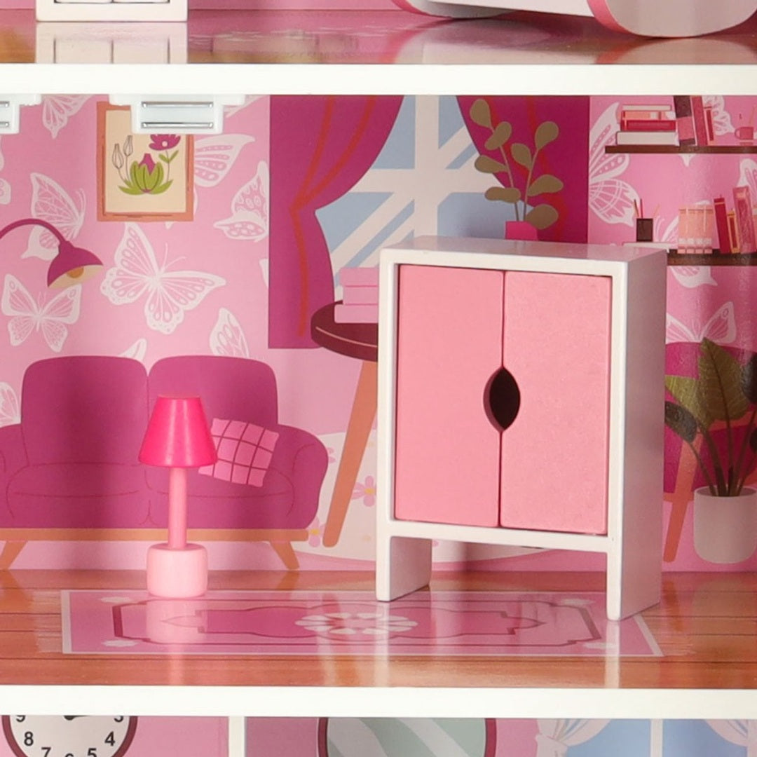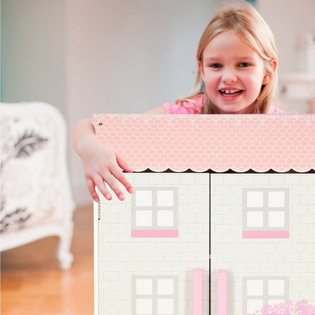 Het drieverdiepingen tellende huis beschikt over vier kamers: keuken, woonkamer, badkamer en slaapkamer. De binnenkant is voorzien van realistische prints die elke kamer extra leven en geloofwaardigheid geven. Het huis heeft zes open ramen en een schuin, roze dak, waardoor het een speelse en charmante uitstraling krijgt.