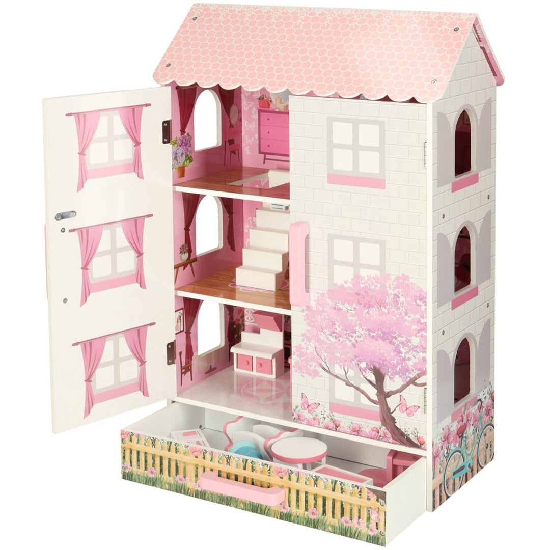 Aan de onderkant bevindt zich een uitschuifbare lade (46 x 21 x 7,5 cm), ideaal voor het opbergen van extra accessoires en speelmateriaal. Dit poppenhuis stimuleert de creativiteit, fantasie en fijne motoriek van kinderen.