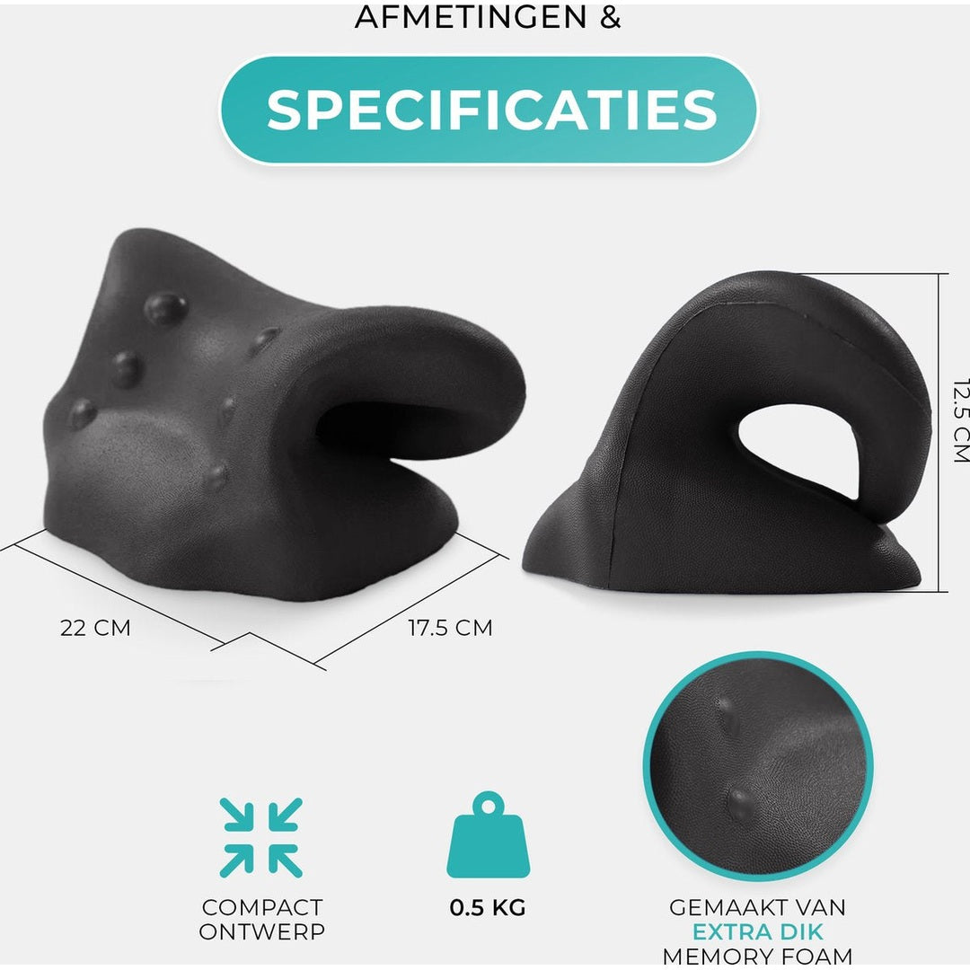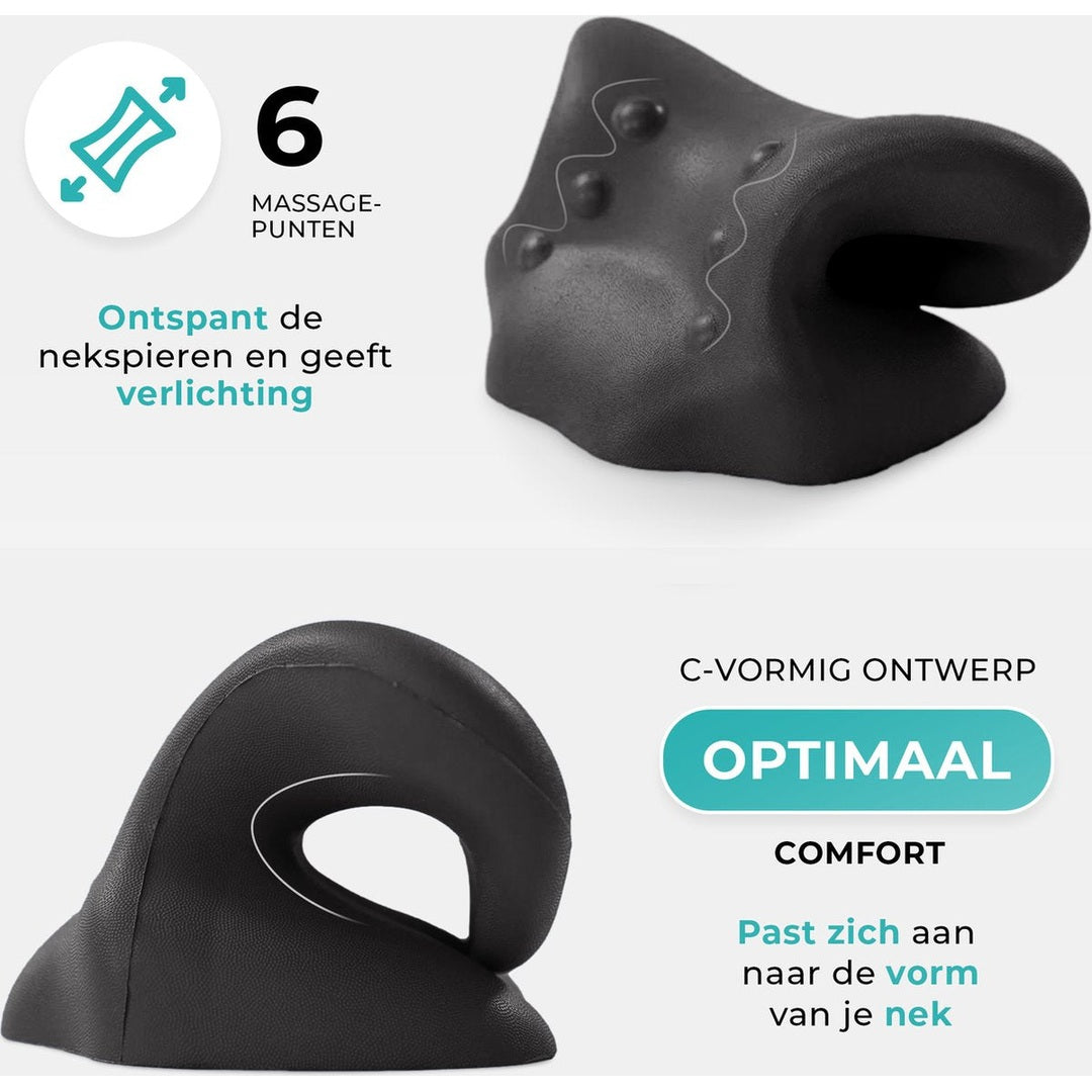 De nekstretcher is voorzien van massage knoppen. Deze knoppen zorgen ervoor dat de nekspieren ontspannen. De v-vormige kromming ondersteunt en fixeert de positie van de wervelkolom en de C-vormige opening zorgt voor een sterkere ondersteuning. Geef jouw nek de dagelijkse ontspanning die het nodig heeft met deze nekstretcher!