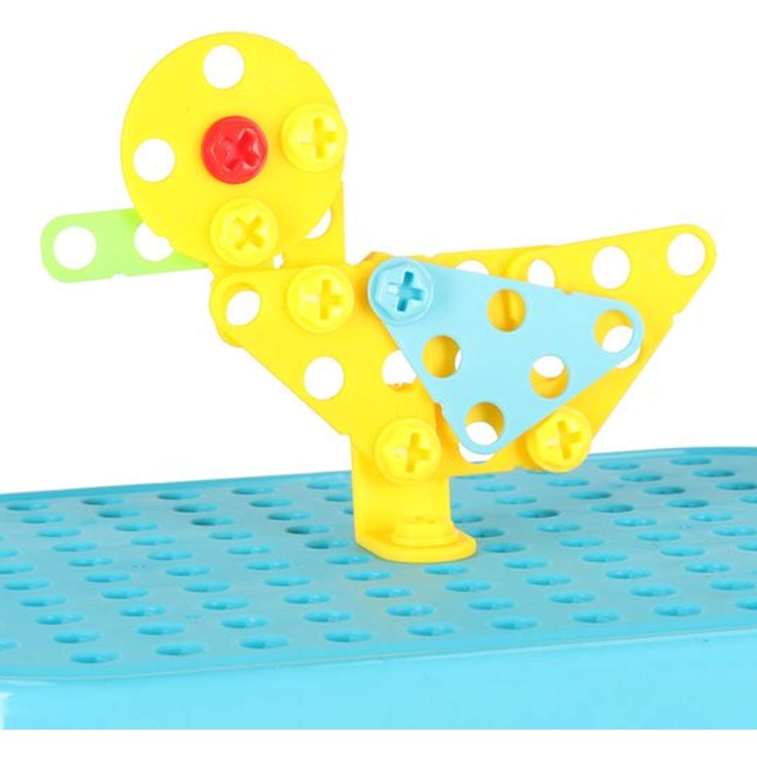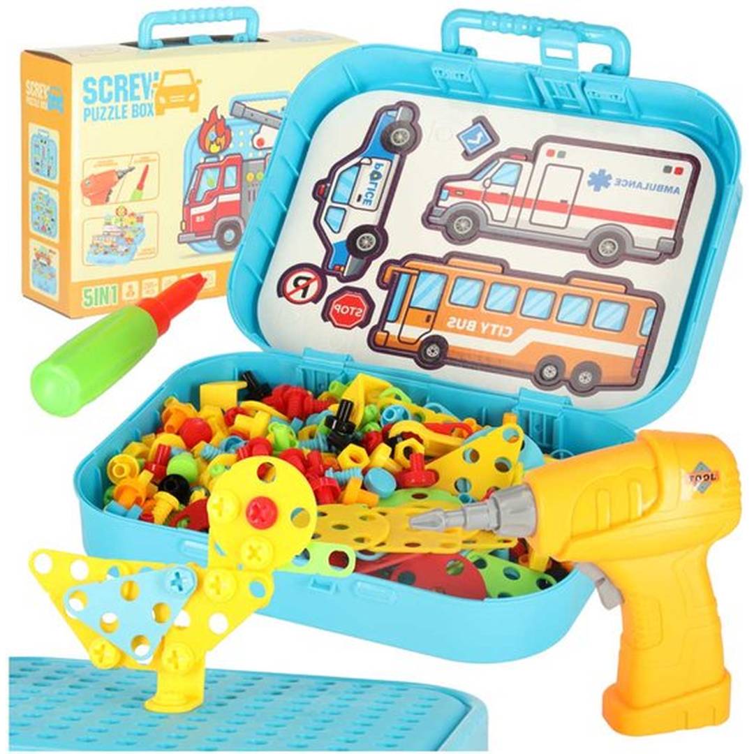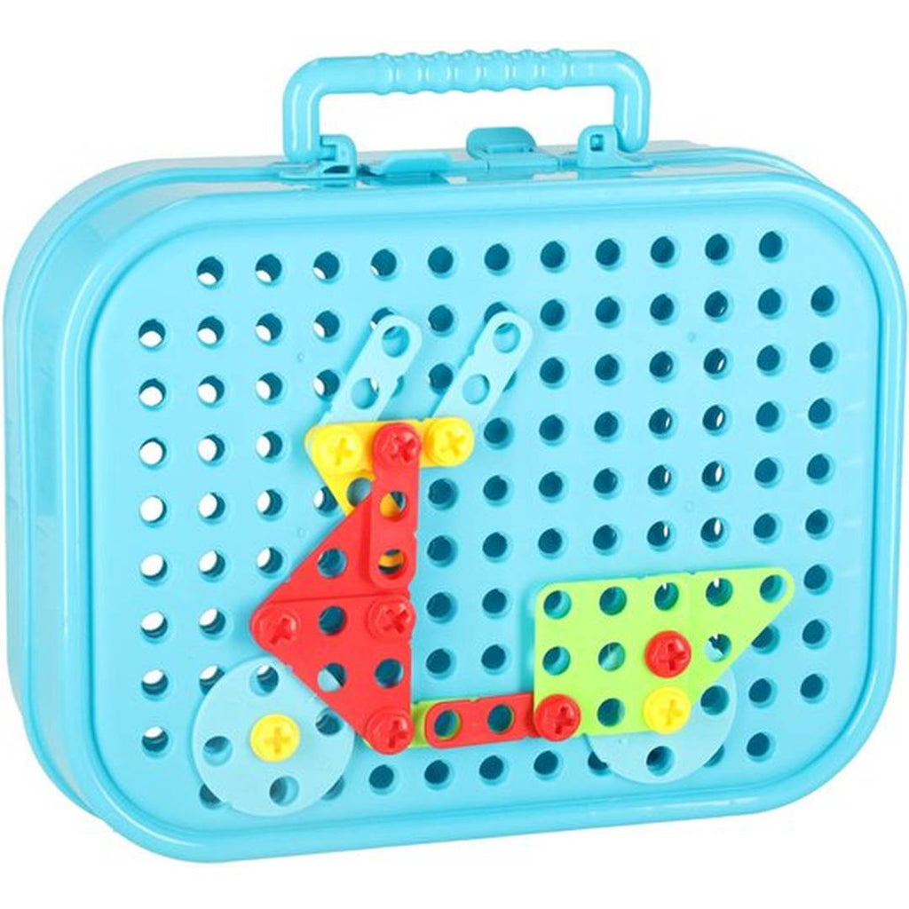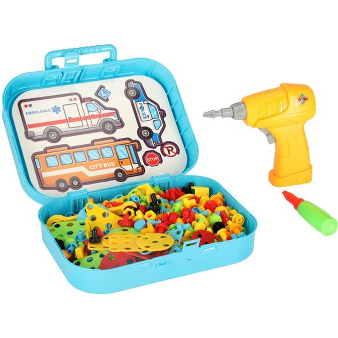 The practical plastic case can not only store all the parts of the set, but also turns into a game board. With the many blocks, bits and screws, the possibilities for creating unique masterpieces are almost endless. In addition, children can create impressive 3D constructions with cardboard vehicles. The set comes with a plastic screwdriver and a drill for even more fun. Building blocks are a dream for every little builder and vehicle enthusiast.